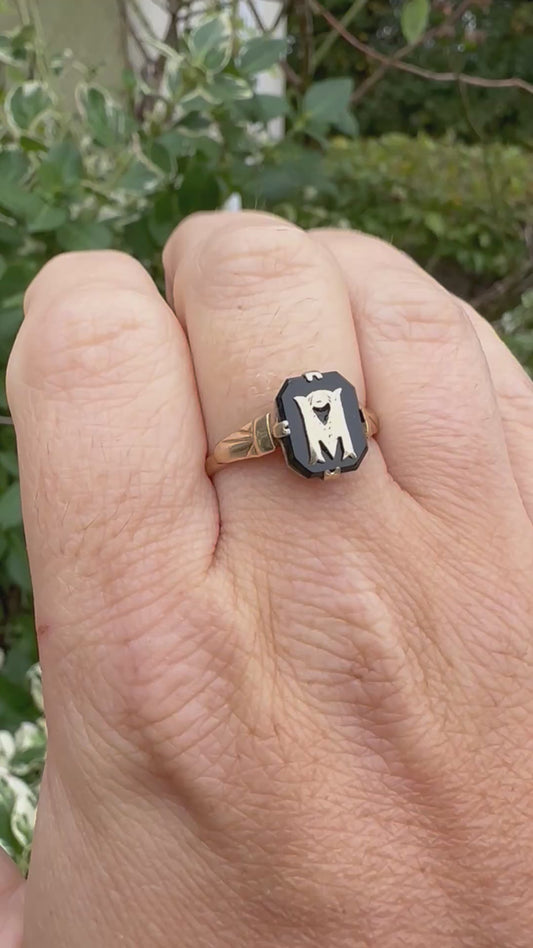 Vintage 9ct Yellow Gold & Onyx P ring with accent Diamond