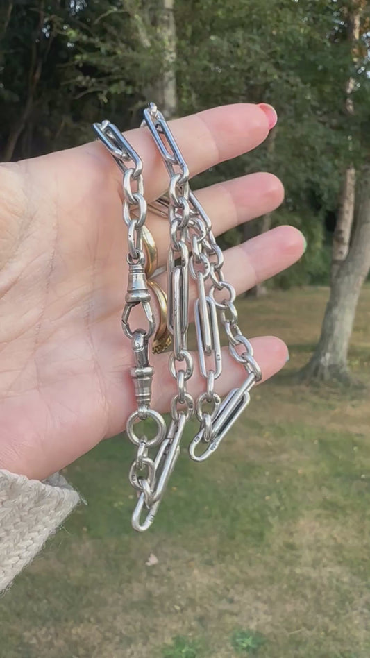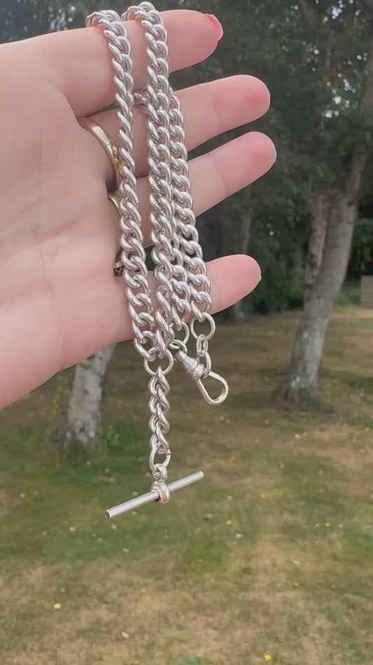 Antique Sterling Silver Open Curb Albert Chain with Sheild Fob, T-Bar and Silver plated pencil