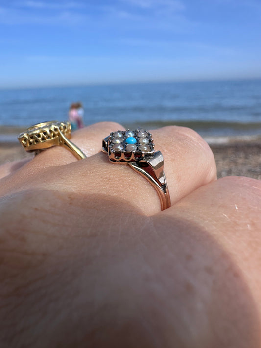 Antique 9ct Gold seed Pearl & Turquoise Ring
