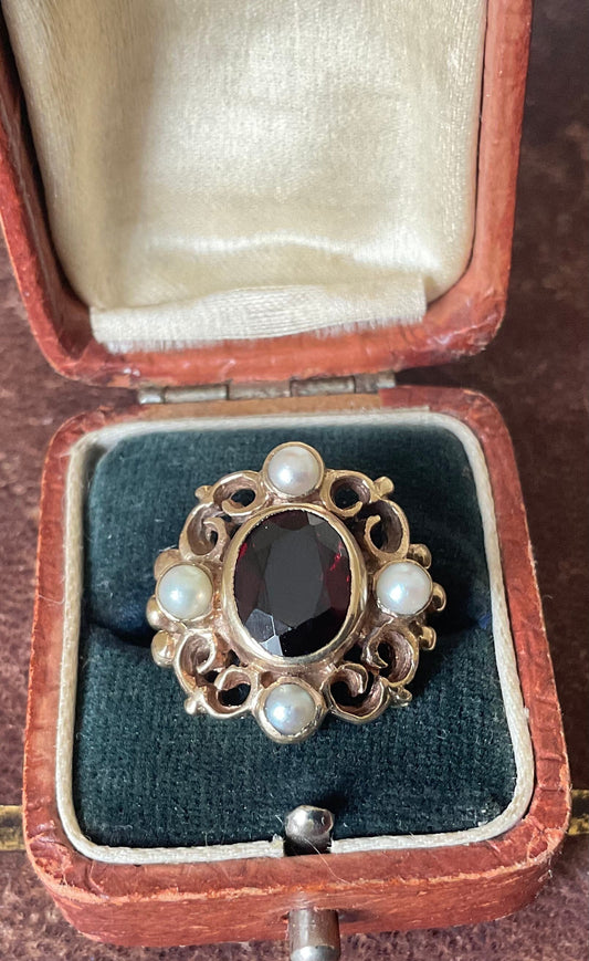 Stunning 9ct gold Garnet & Split pearl Filigree ring