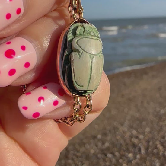 Scarab pendants have been popular for centuries especially by the Egyptians who would adorn their dead with scarabs to protect them and help them travel to the after life. It became very popular once again during the 1920s with Egyptian revival jewellery. Once more people are enjoying wearing scarabs as they represent good luck, rebirth and protection. This lovely carved scarab has a lovely green blue hue with hieroglyphics carved into the back. It has been set into 14ct rose gold. It will look fab in anyone’s jewellery collection and hopefully bring you some luck.