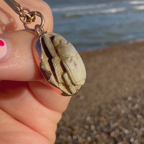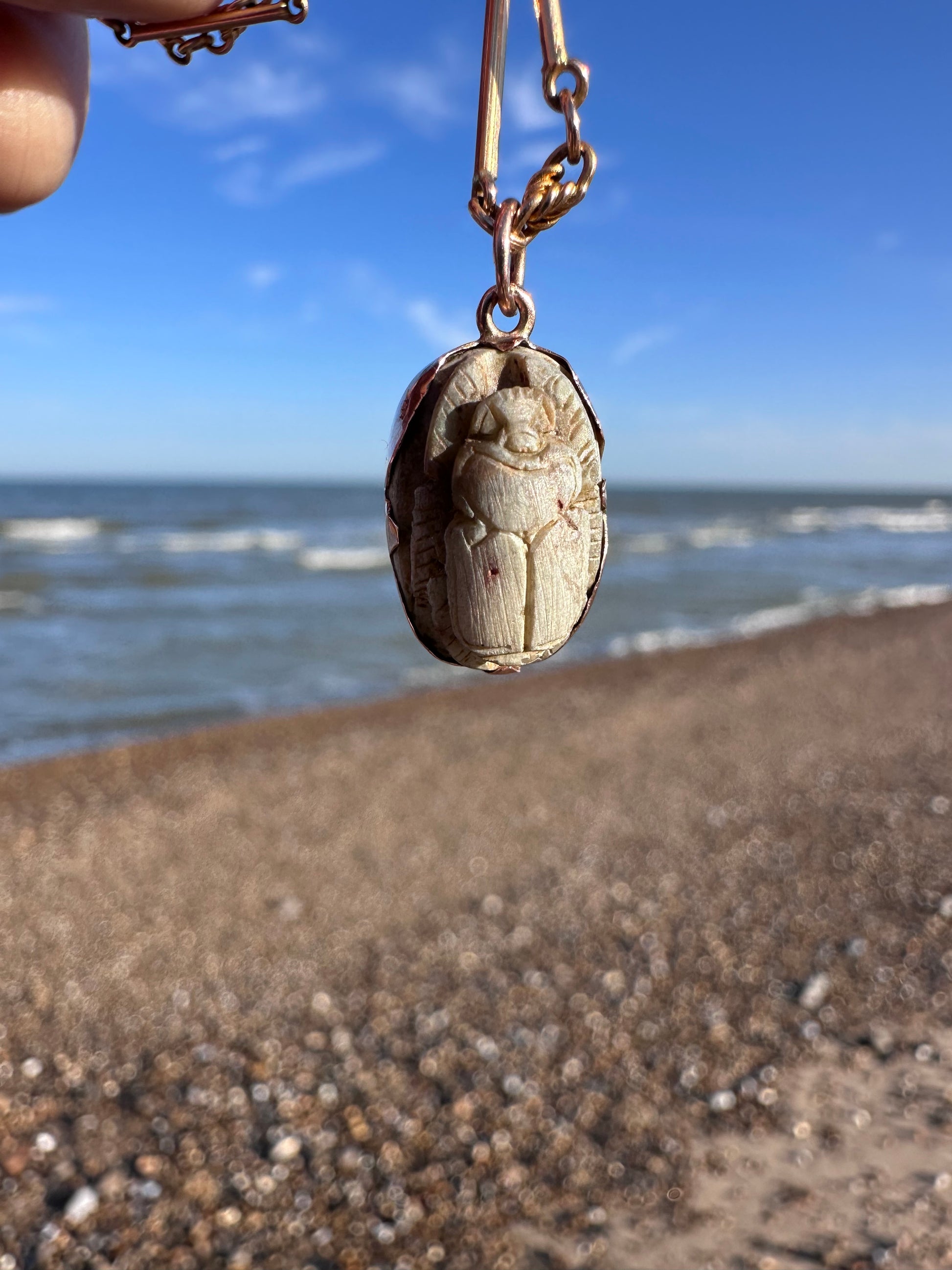 Scarab pendants have been popular for centuries especially by the Egyptians who would adorn their dead with scarabs to protect them and help them travel to the after life. It became very popular once again during the 1920s with Egyptian revival jewellery. Once more people are enjoying wearing scarabs as they represent good luck, rebirth and protection. This one is a lovely carved piece which has a grey colour to it. On the back it is adorned with hieroglyphics. It is set into 14ct rose gold. it would make a great addition to anyone who loves to wear good luck charms.
