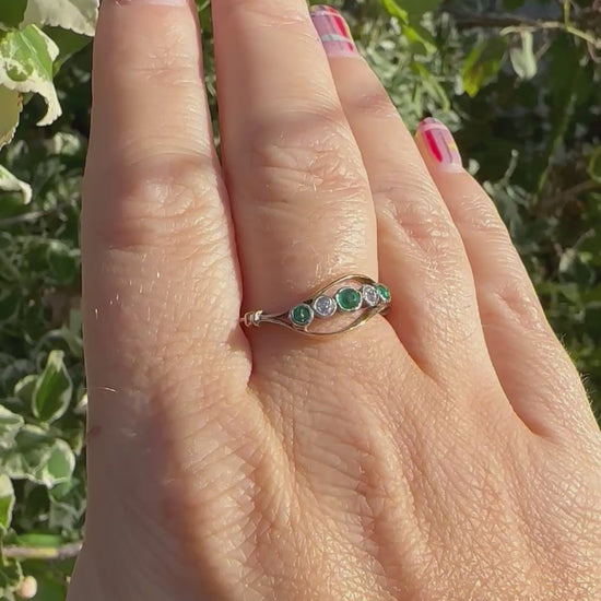 Enigmatic Emeralds! Emeralds are probably the most asked for gemstone, I think most jewellers will agree and therefore they are always harder to get your hands on. I was lucky enough to source this piece to bring to you all. It is a 5 stone ring holding 3 bright green emeralds, the colour is divine and two Diamonds, all bezel set, which is gorgeous. I love the wave like band going above and below the stones and the shoulders are pretty too. It would look amazing as part of stack but it’s, colour and style means it would look fab on its own too.