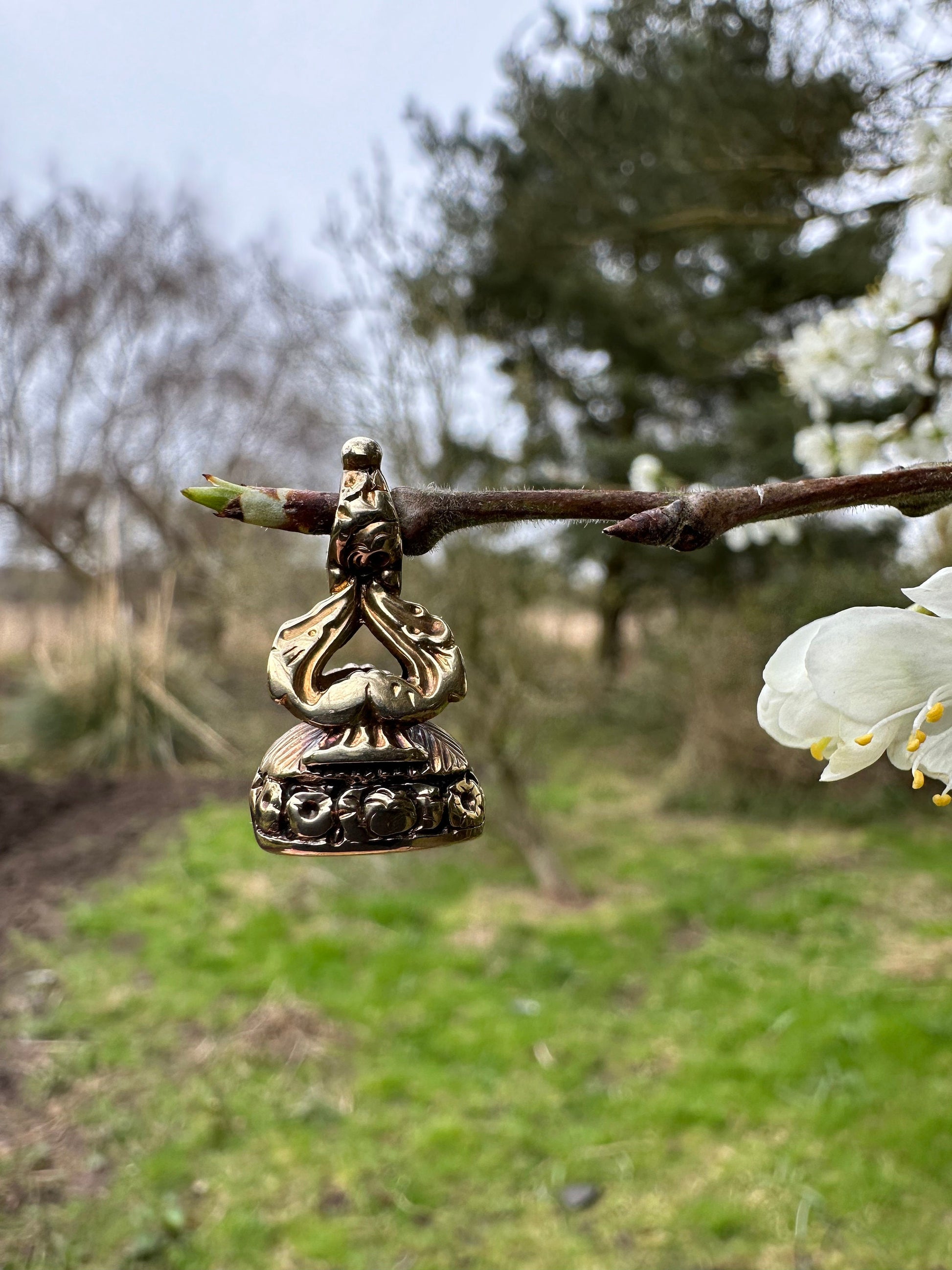Stunning Bloodstone Fob. This fob is so gorgeous it has an amazing carved mount with flowers and ribbed back. I believe the mount where the stone is held is gold cased, as is common with these types of fobs. The bloodstone is bezel set and has a bevelled edge which is a lovely detail. It’s such a sweet piece i love that it is overly big so easy to add to your neck stack.