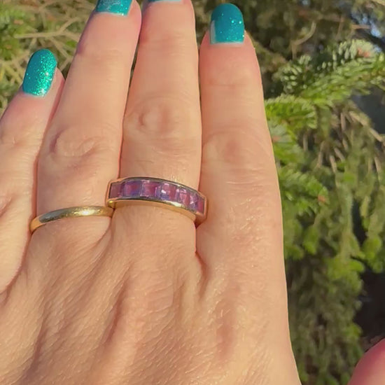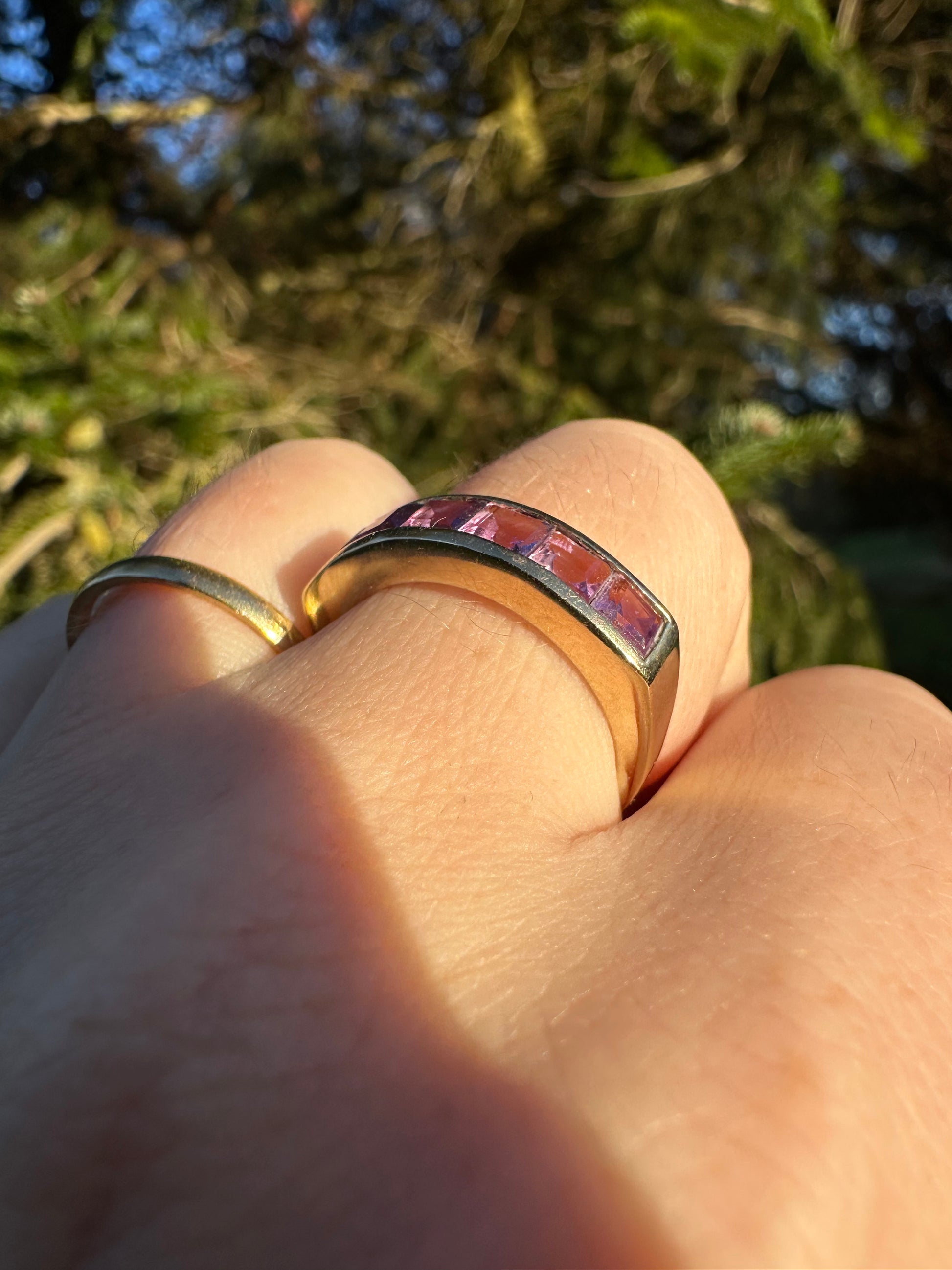 Love the colour of these Amethysts they are such a vivid purple. The square cuts are gorgeous and mean that the ring is a perfect stacker band. It’s a wide ring, 5mm, so has great finger coverage for wearing individually.
