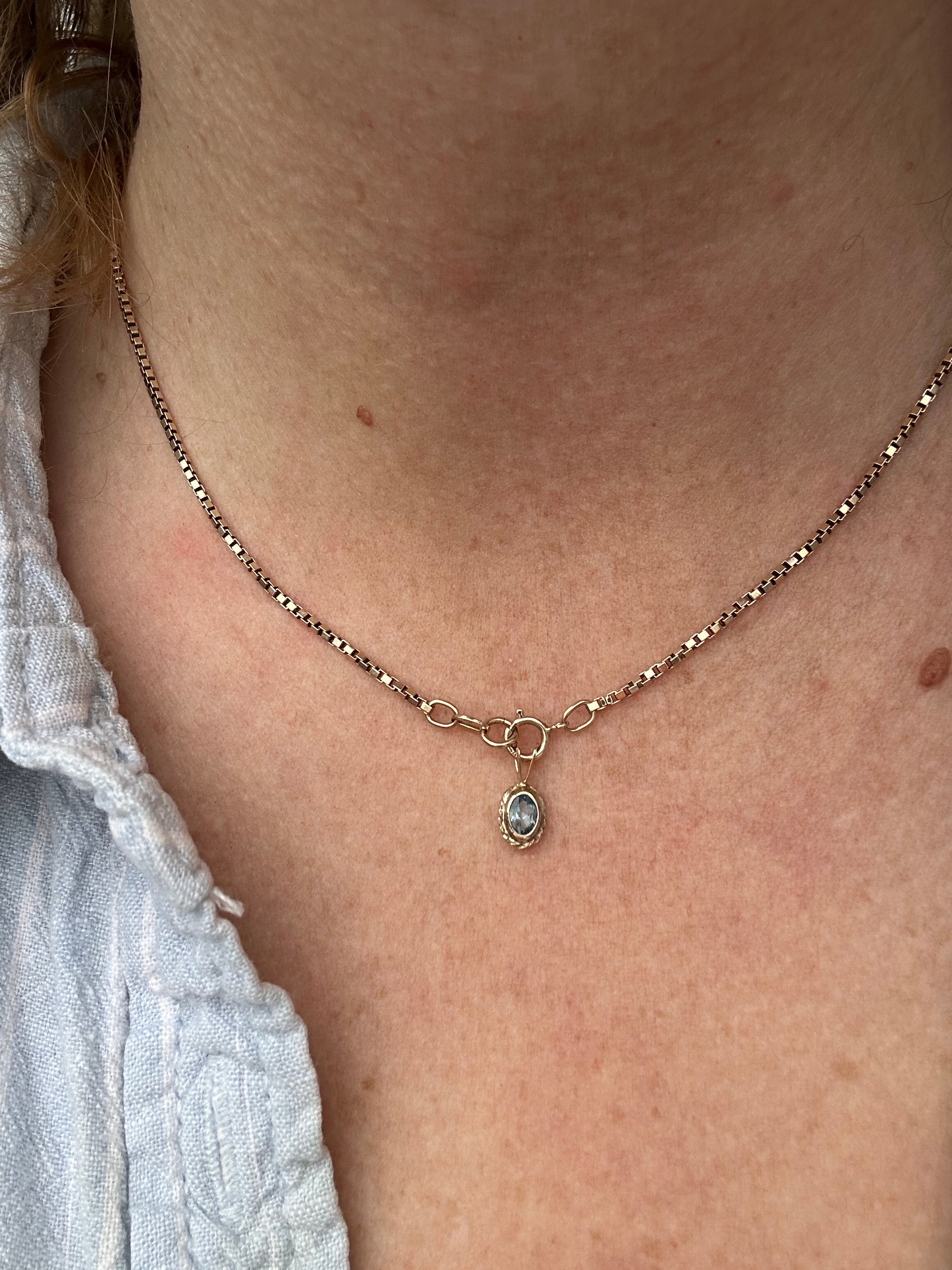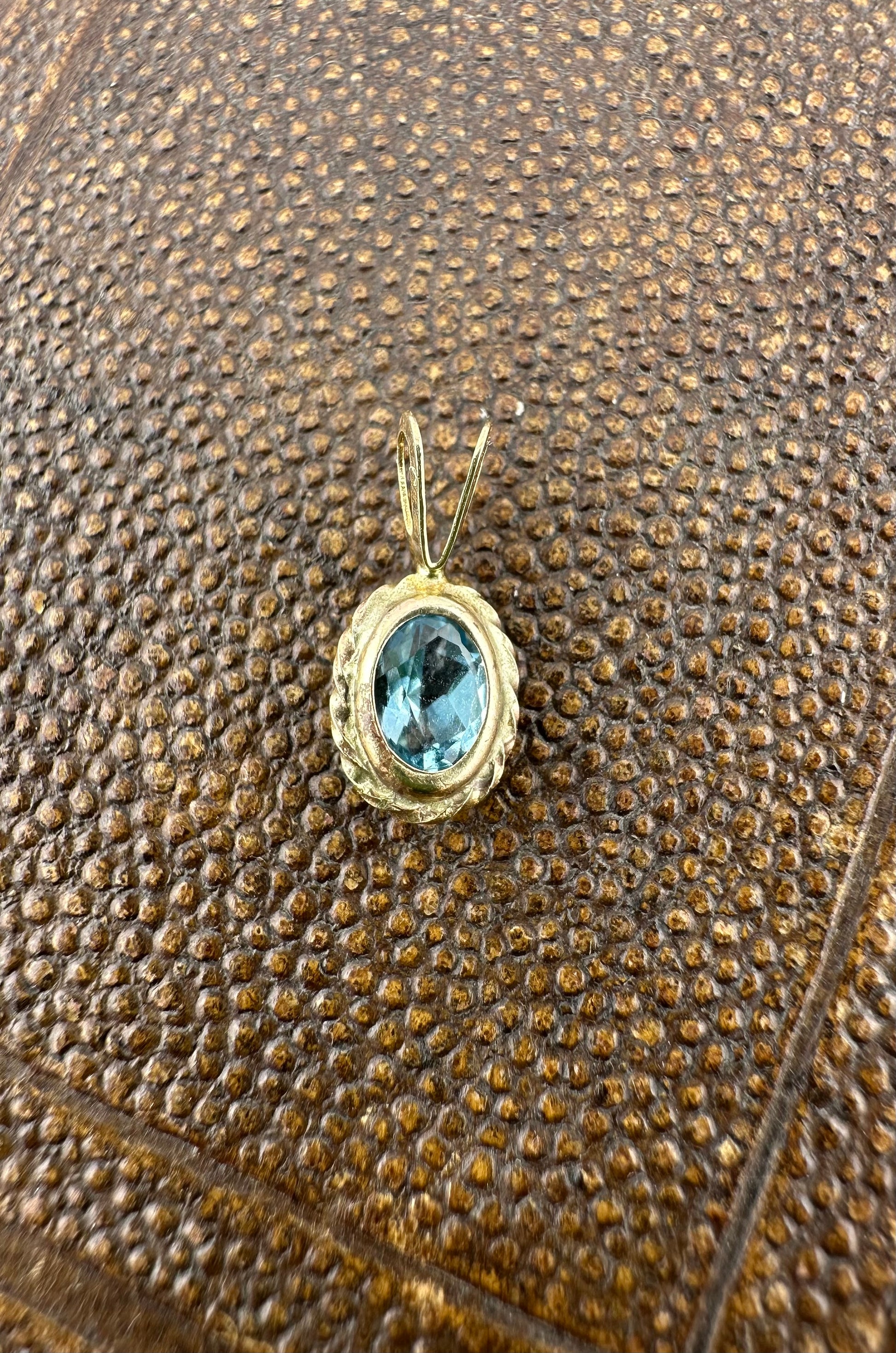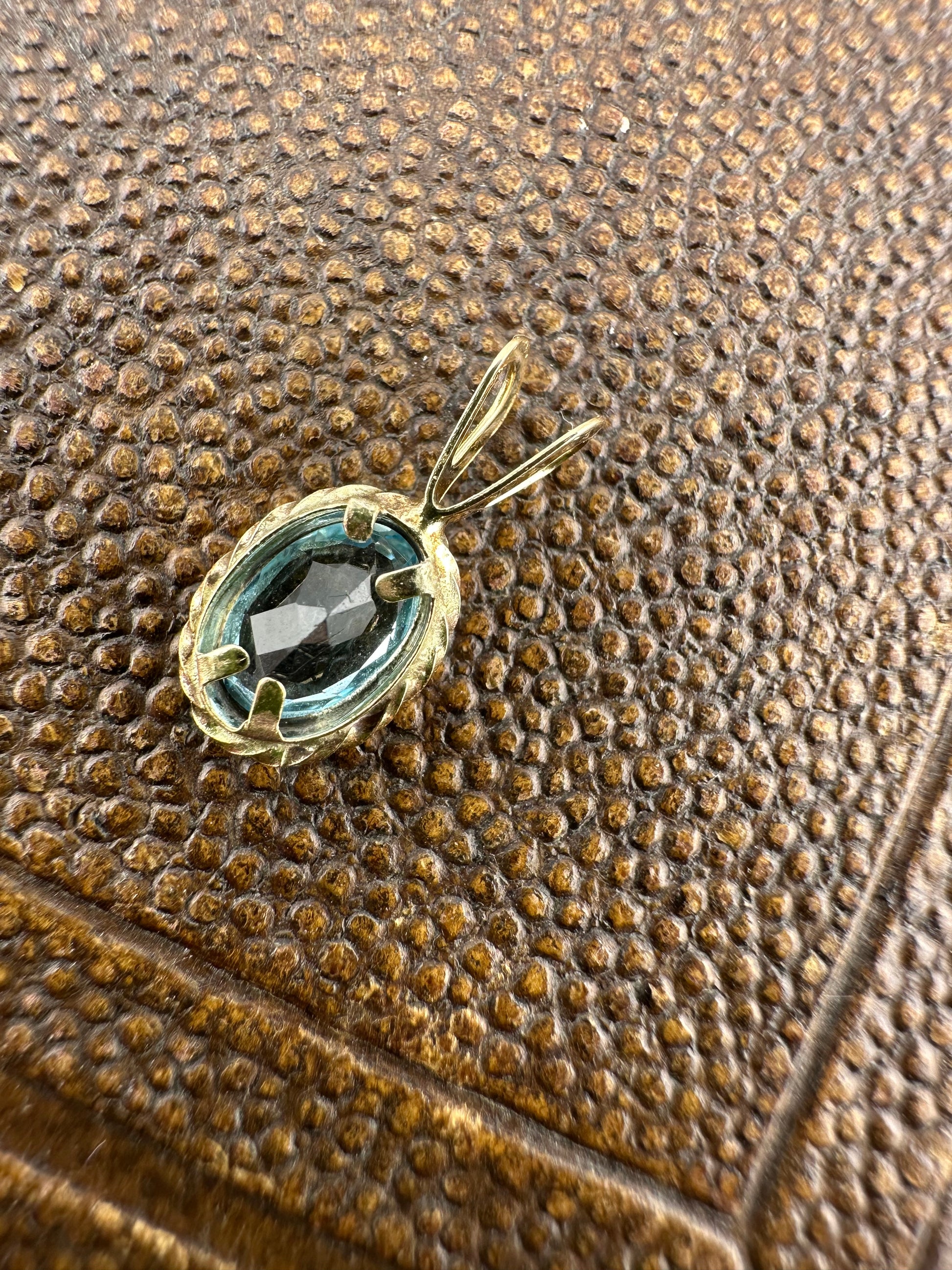This is the cutest little topaz charm. It’s small but detailed with its rope edging. It would add a pop of colour to your charm jumble/neck stack. I love the light blue colour.
