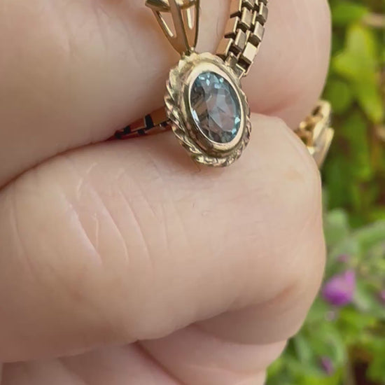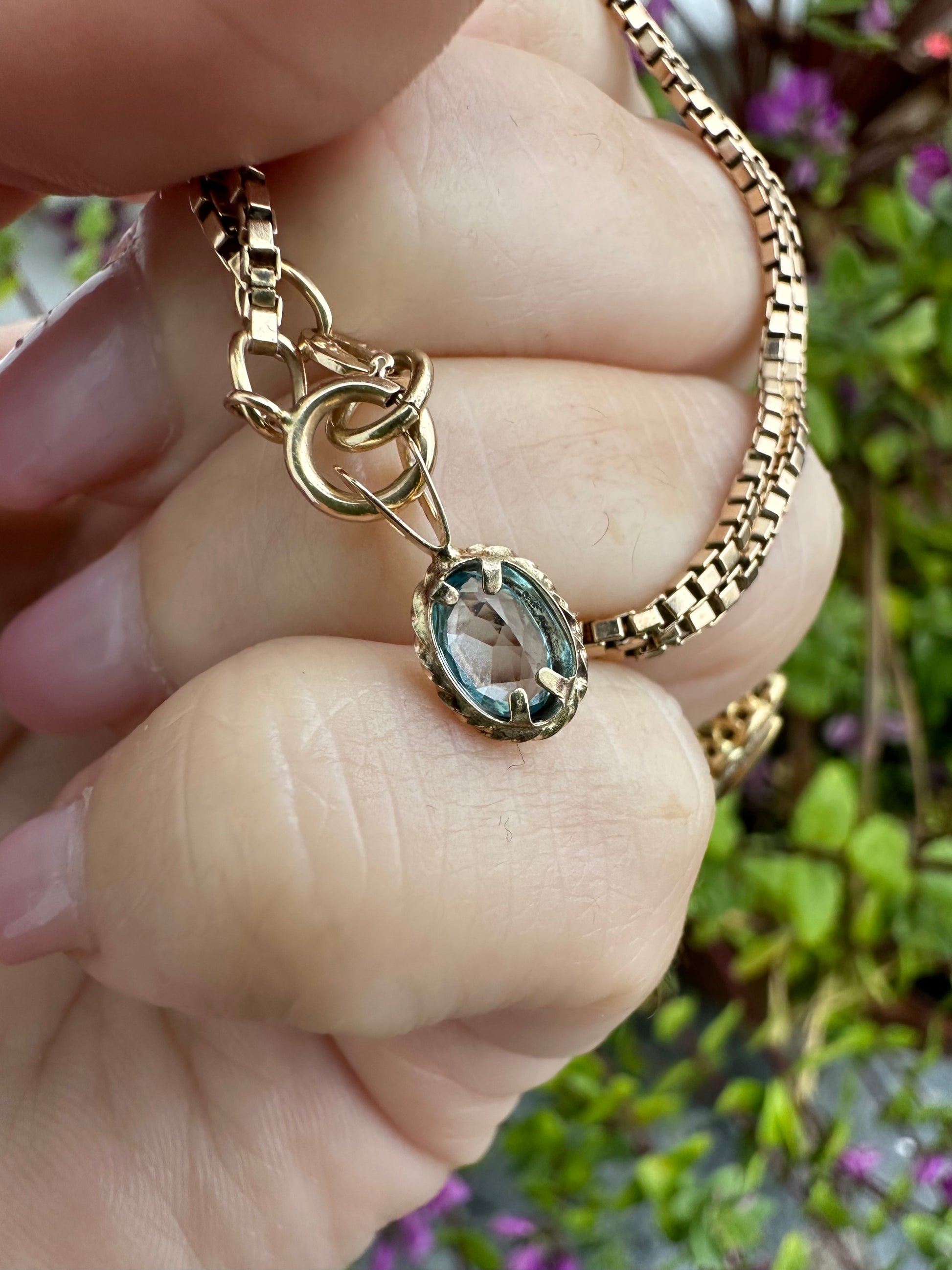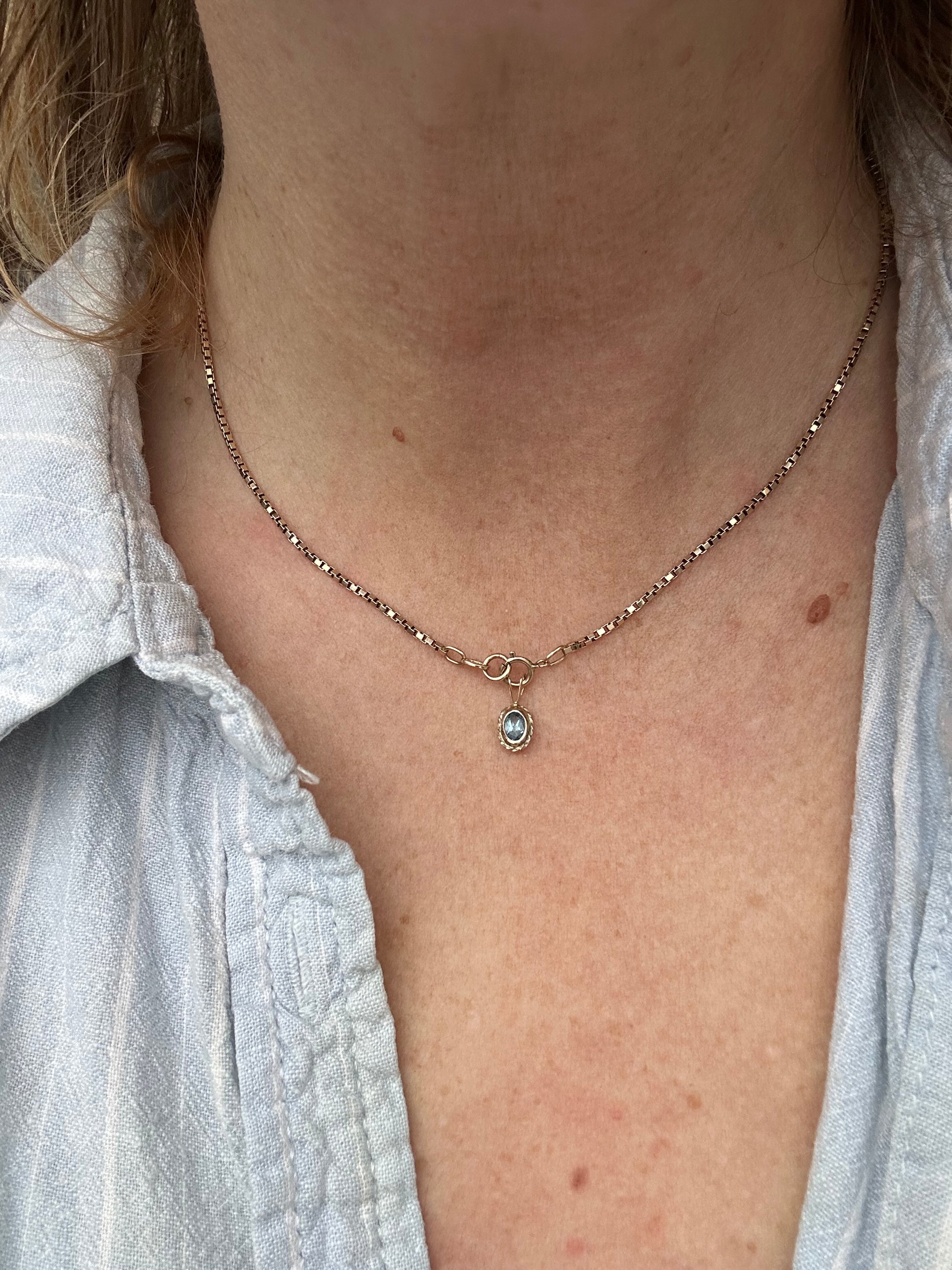 This is the cutest little topaz charm. It’s small but detailed with its rope edging. It would add a pop of colour to your charm jumble/neck stack. I love the light blue colour.