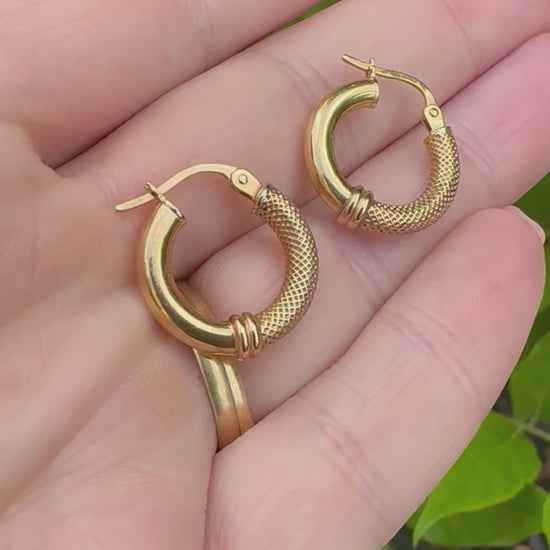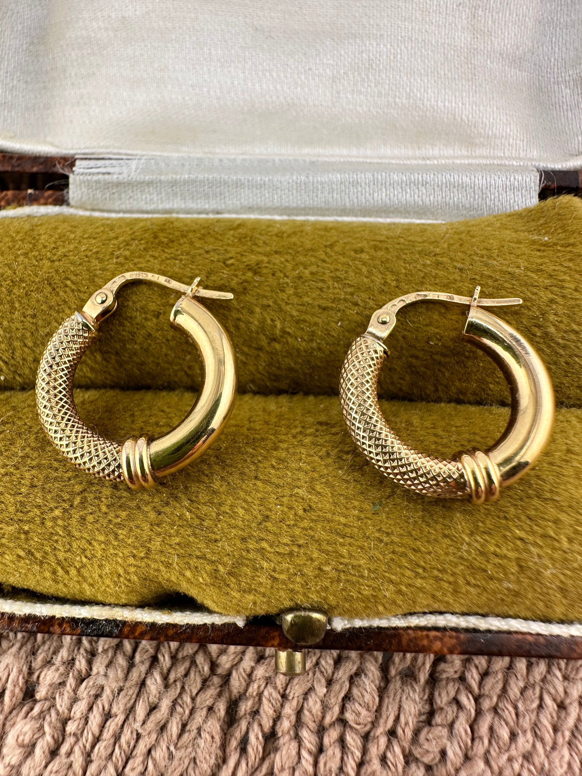 9ct Gold UnoAerre Small Round Hoops, half textured, half polished