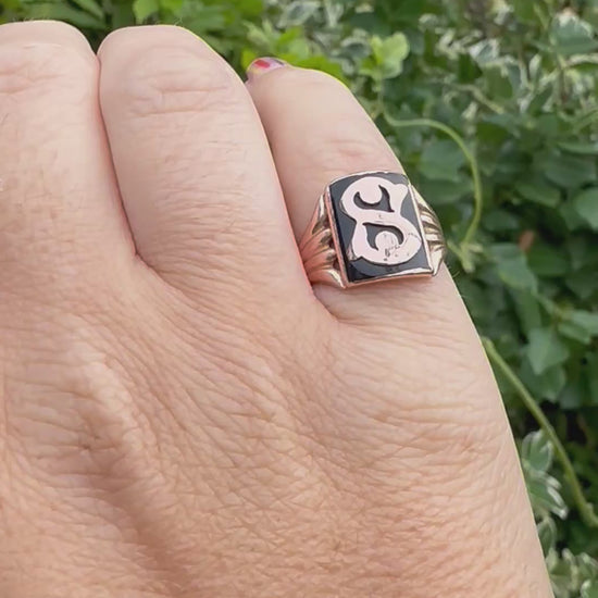 Chunky Pinky Initial ring. This is a great initial ring its chunky and larger but not so massive that it can’t be used perfectly as a pinky ring. Initial rings are a fab addition to your jewellery collection, adding that personality. Chose an initial of yourself, loved ones or pets, its a way of making your collection yours. The shoulders of this ring are stunning and the gothic S is superb.