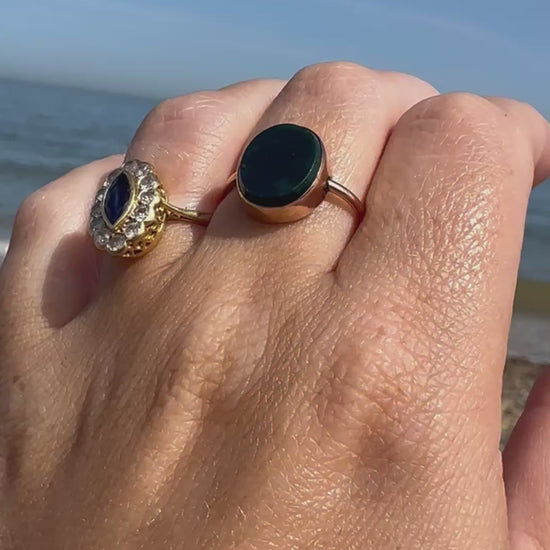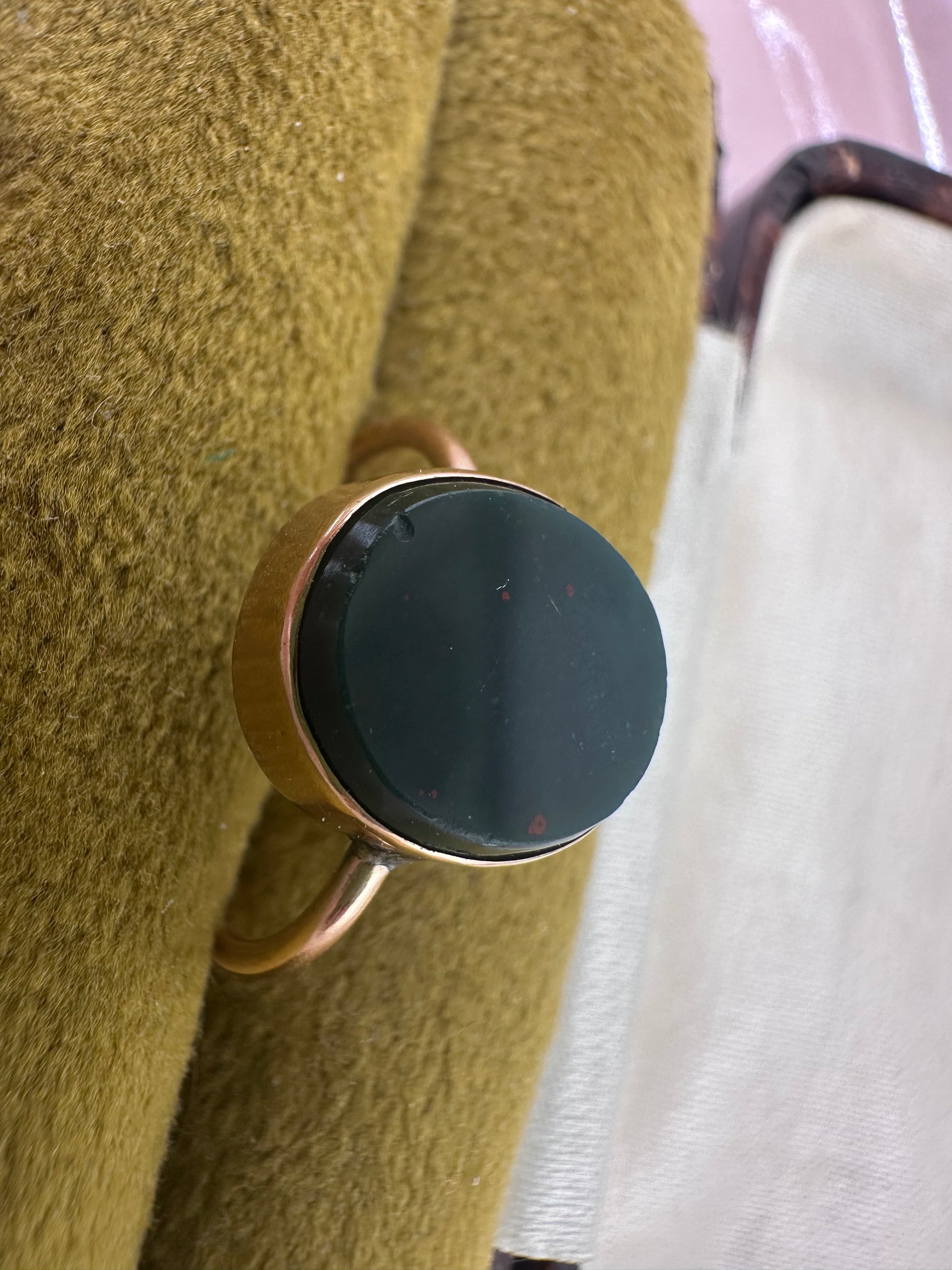 This is a really lovely Bloodstone ring it has the classic dark Green colour with flecks of red. It’s quite a large size and a lovely oval shape making a simple but statement piece.