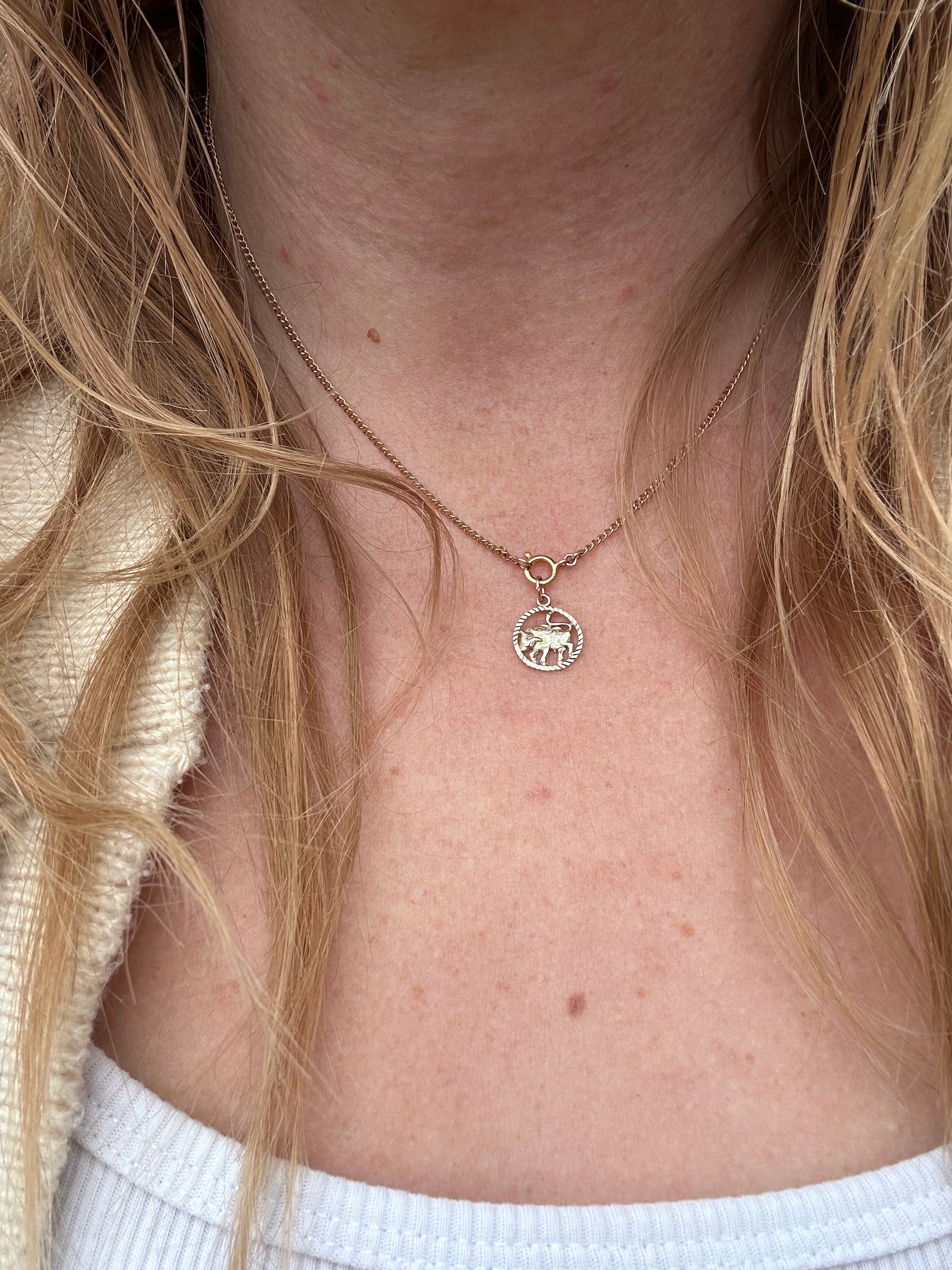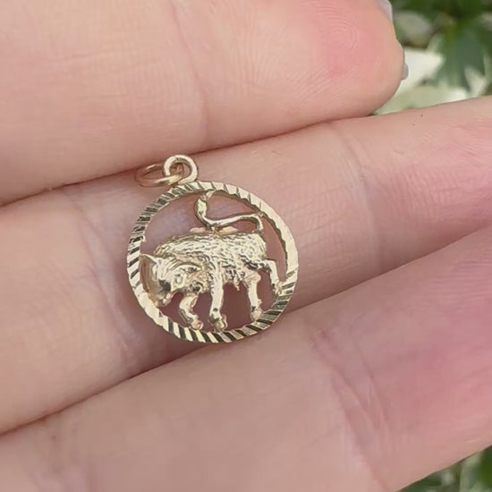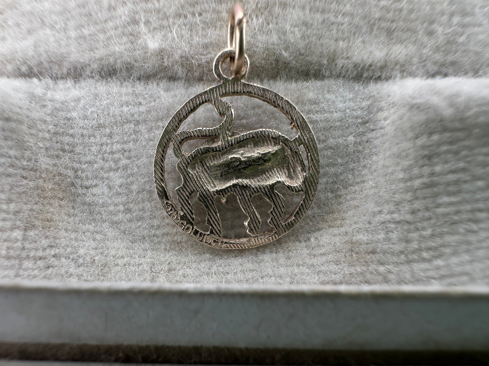 Sweet Taurus charm. This is a cute zodiac charm. I love the little bull in this charm he looks like he is clawing the ground, giving him movement and energy. The round frame of this is gorgeously engine turned meaning it catches the light and adds some shine and sparkle to your neck stack.