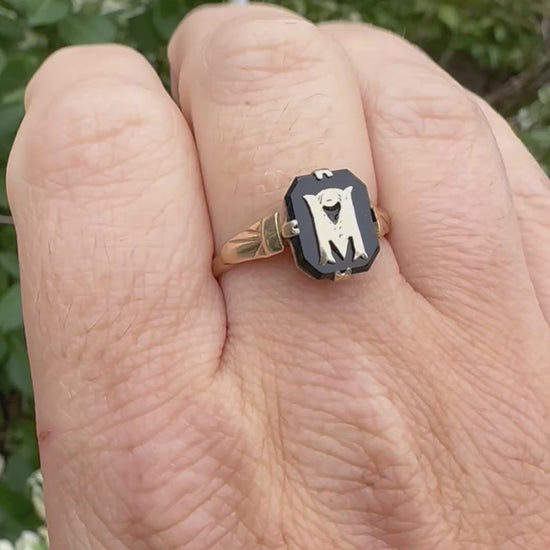 An initial ring is a must in an antique and vintage jewellery collection because they have been a constant love throughout history, worn to represent our selves or as part of morning and then in more recent history we enjoy representing our living loved ones from children to pets. I personally have an Onyx B (for Becks) ring in my own jewellery collection, I wear it a lot! This is a lovely M or W ring which has these amazing Art Deco rays of sunshine shoulders, it’s always in the details.