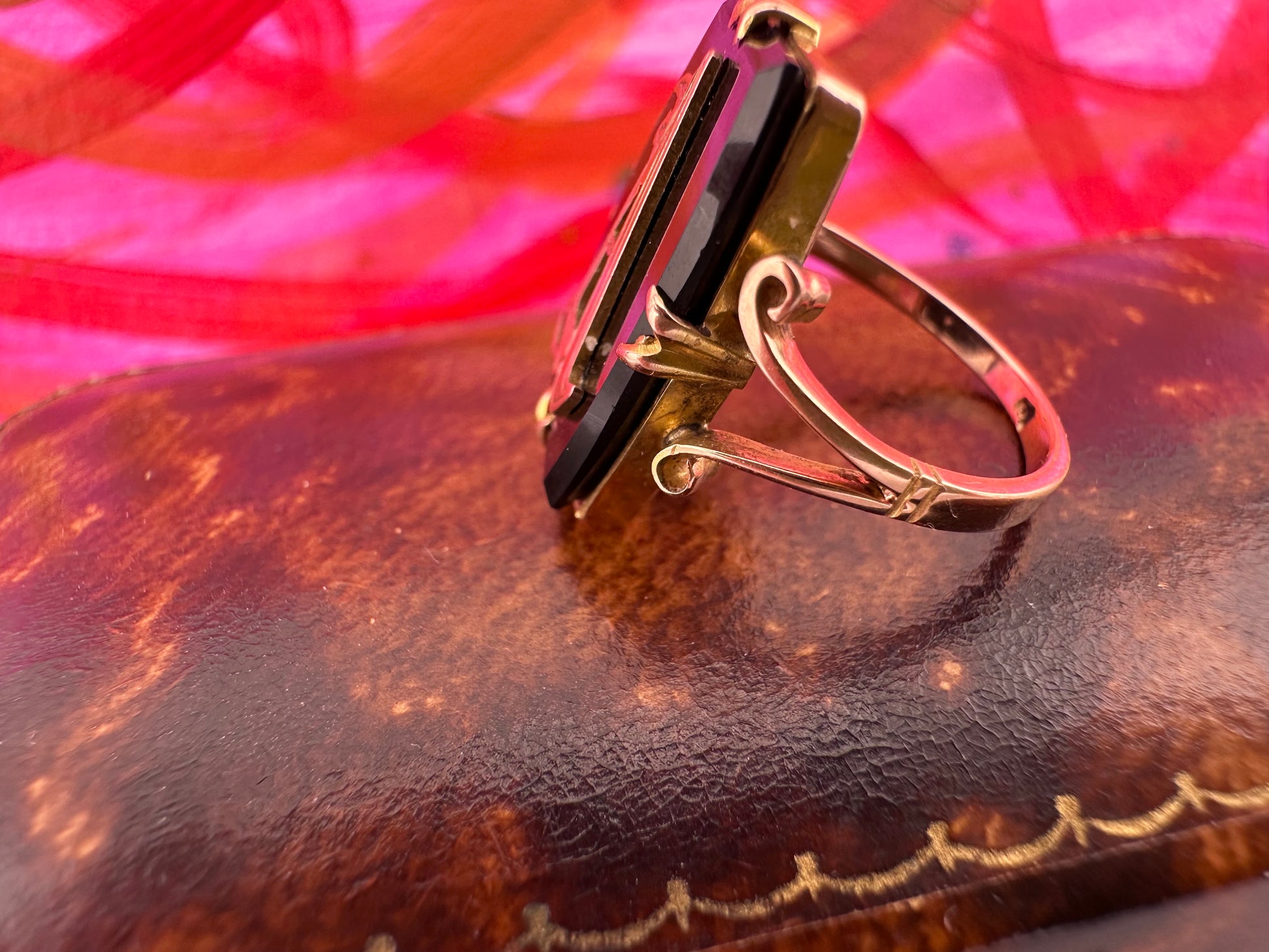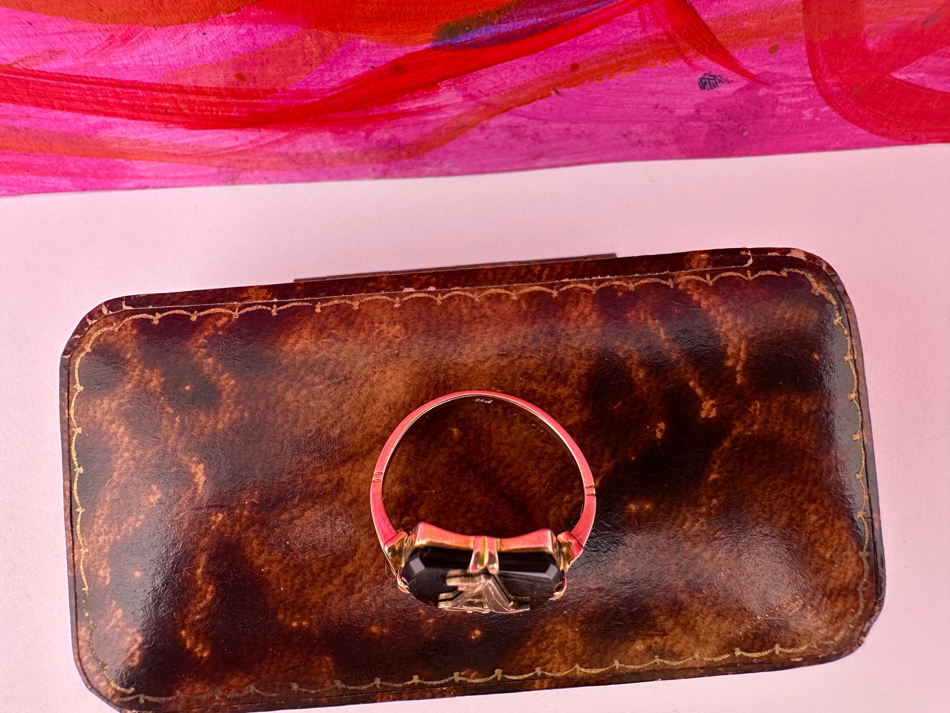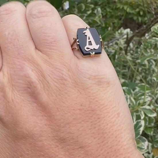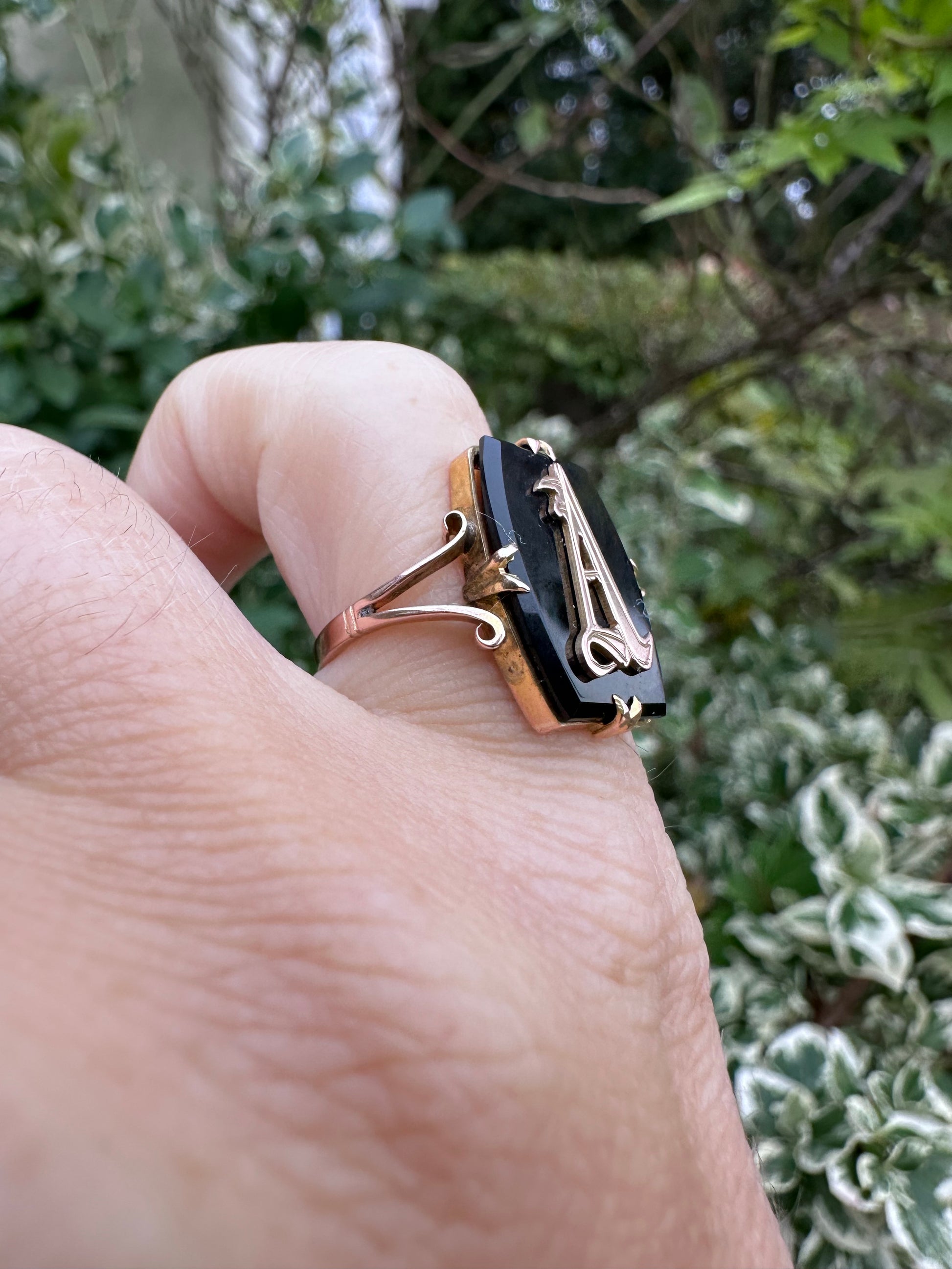 Initial Pinky ring. If you’re looking for a unique personal pinky ring this is perfect. These onyx initial rings, are the perfect way to add personality to your jewellery collection, adding the initial of yourself or loved ones. I love the gothic A with the claw settings with scrolling shoulders. I especially love the shape of the onyx, of which I have never seen one like it before.