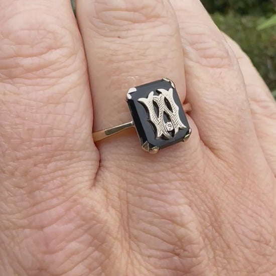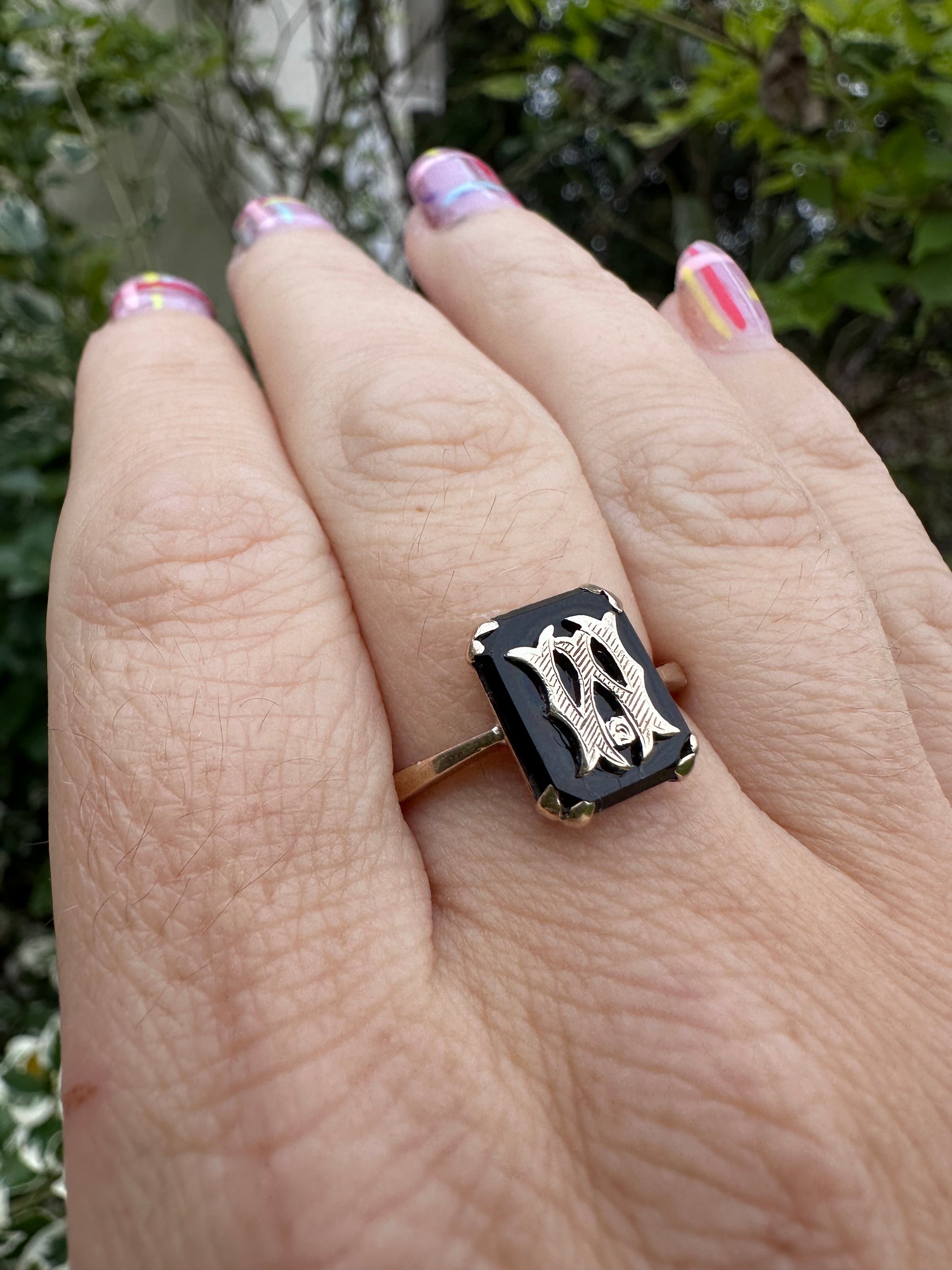 Simple yet gothic. This style of ring is one of my favourites, I own an Onyx B ring myself so maybe I am biased? I try to put together 1 collection of these rings a year, they aren’t the easiest to find. An initial ring is the ultimate way to personalise your vintage and antique jewellery collection. You can wear your own initial or that of a loved one, from children to pets. This W/M ring I particular like as it has this simple look but actually has some lovely details, such as the claw sitting. Generally these rings with claw settings have the claws on each side but this one is on each corner and i love little details like that. The W/M itself is a fab gothic font.