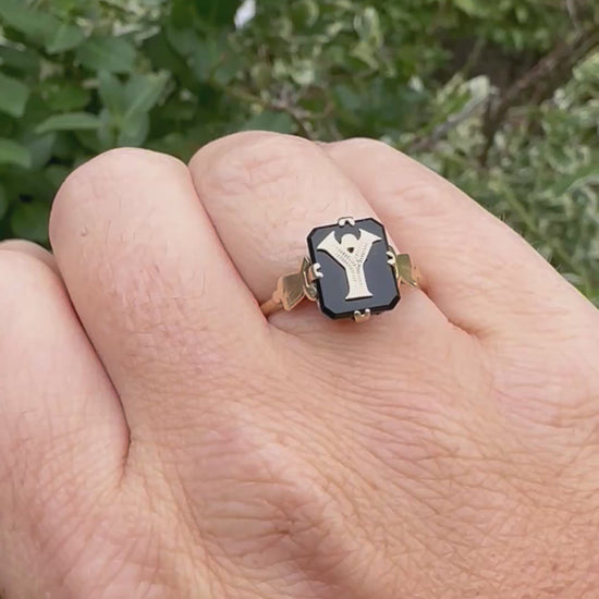 The first Y initial ring I’ve found. These Onyx initial rings are gorgeous and one of my fave things to find. I love the mix of gold and black. I also think they are perfect for adding a personal touch to your jewellery collection, adding initials of yourself or loved ones. This is a classic style for these rings with the lovely patterned Y in the centre of the onyx, it looks fab.