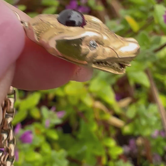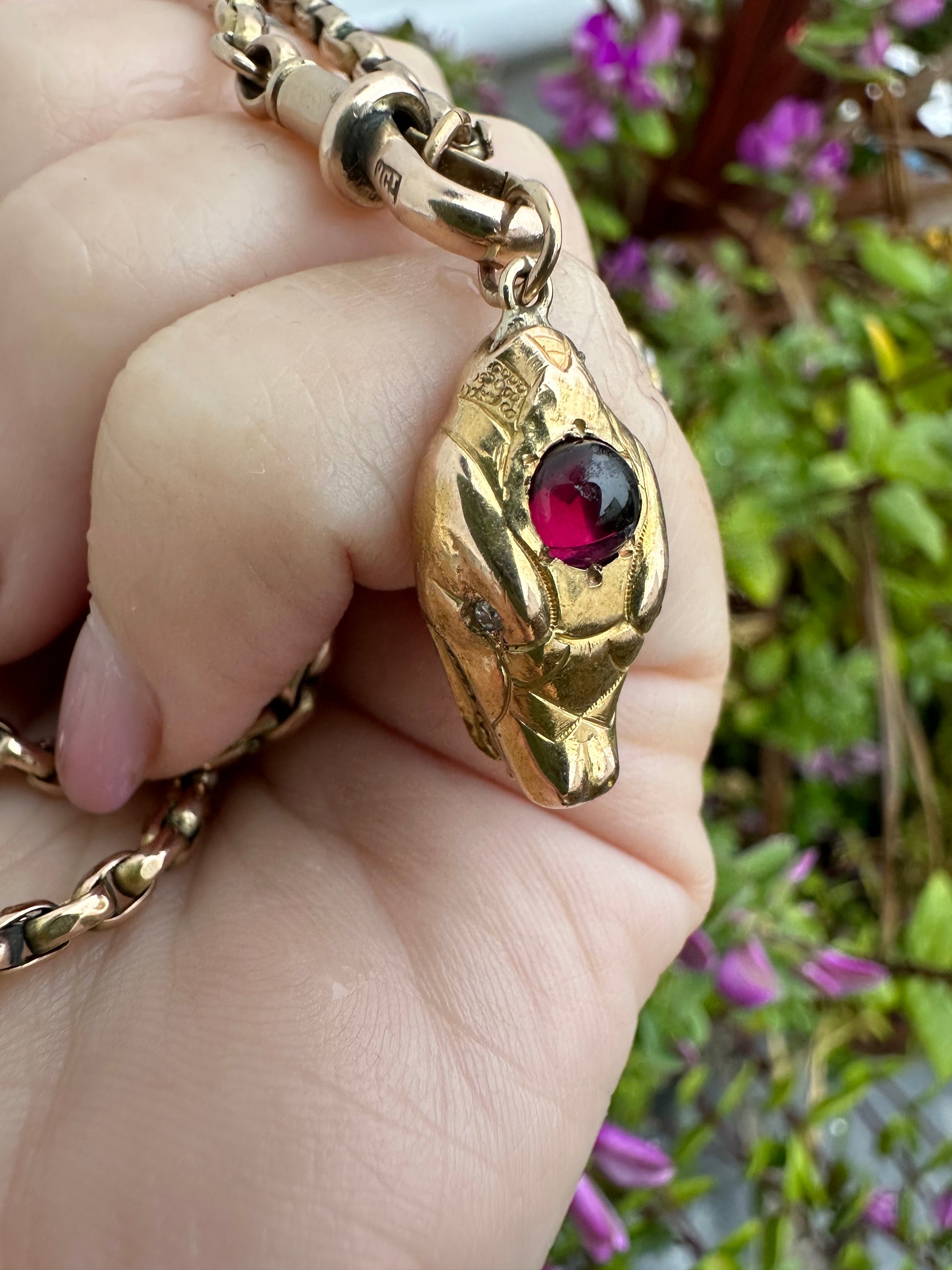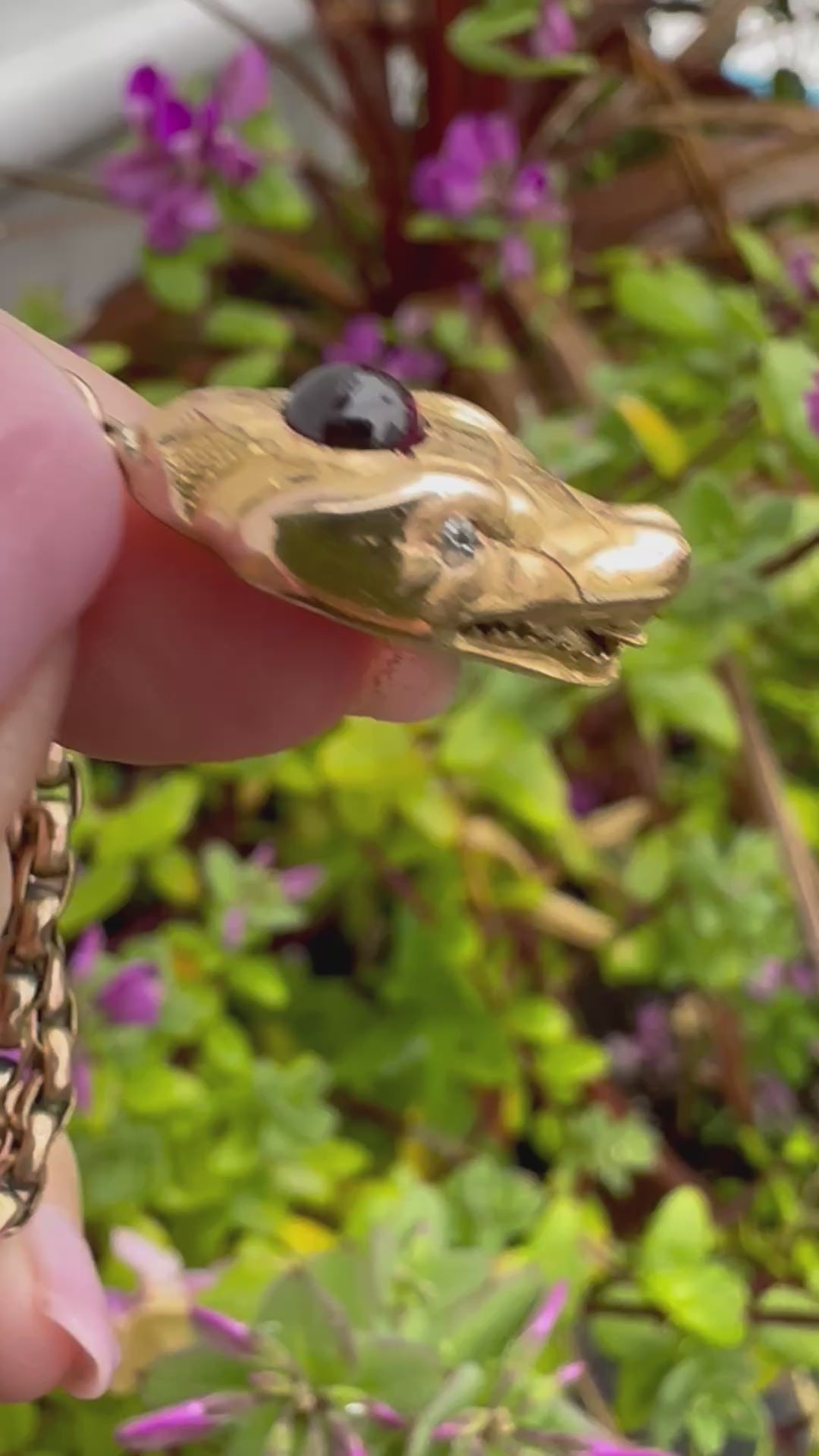 This is genuinely one of my all time favourite pieces I’ve sourced. It’s not perfect but it’s insanely divine. I believe it to be a dragon head but could easily be a snake head too. It has a stunning cabochon garnet in the head (it is cracked but still secure) and 2 diamond eyes. The detailing is stunning all the engraving to create scales and then don’t even get me started on the teeth and tongue! It looks so good hanging from an antique chain as part of a stack.