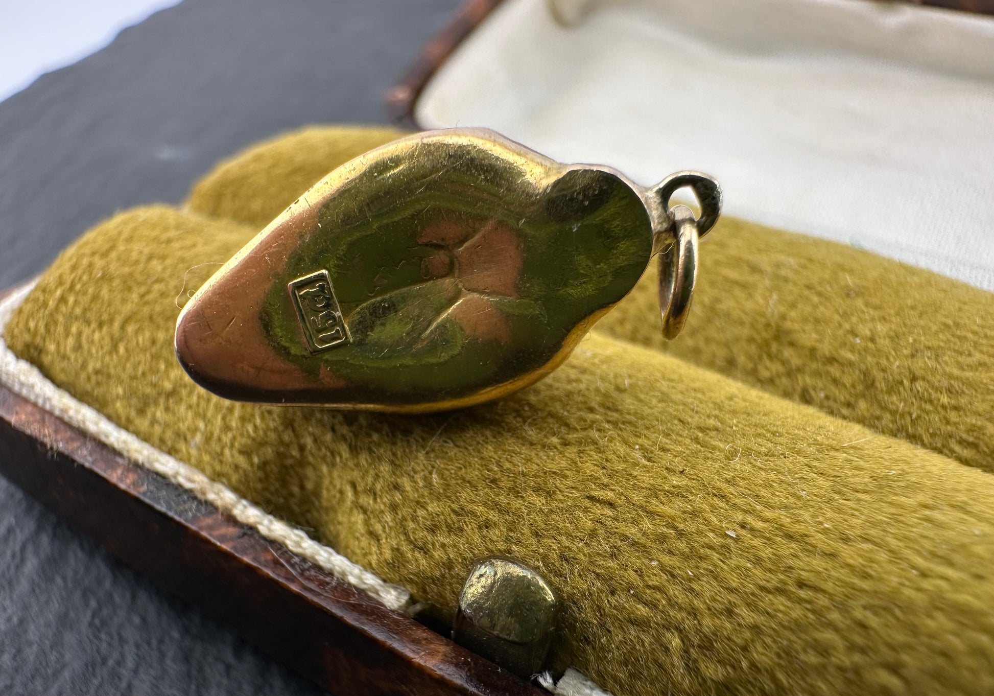 This charm is in fair condition, overall it’s fab just the cabochon garnet has a crack, but it’s still securely in place. It has been cleaned and polished.