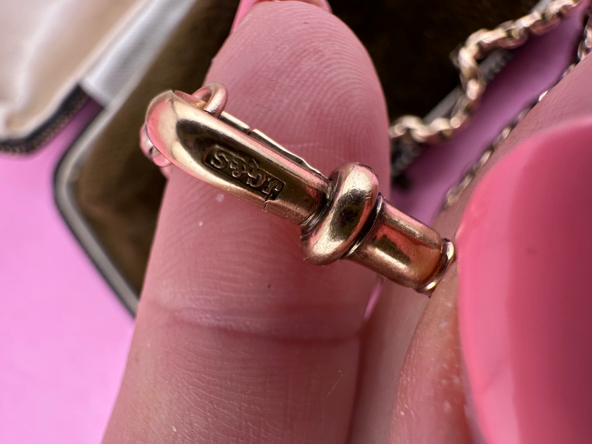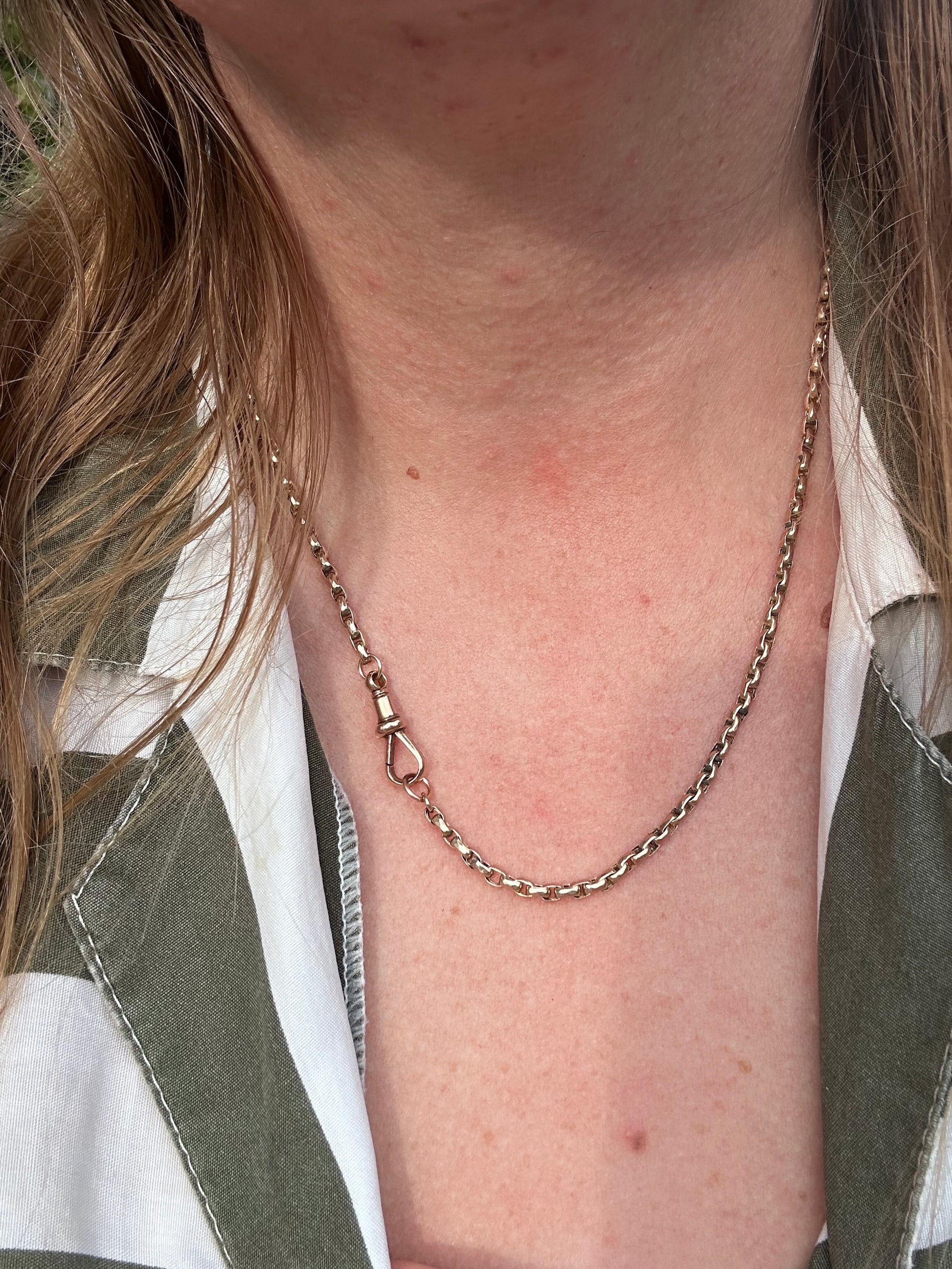 Love a peachy chain. This really is a lovely chain, the links are so pretty with their oval shape and them being slightly faceted. The peachy gold colour is fabulous as it is such a pretty hue and as it sits between rose and yellow it goes nicely with either and even better as part of a mix metal stack. The dog clip doesn’t just look good it also provides you with a great place to add charms. This has been made from an antique long guard we saved from being melted.