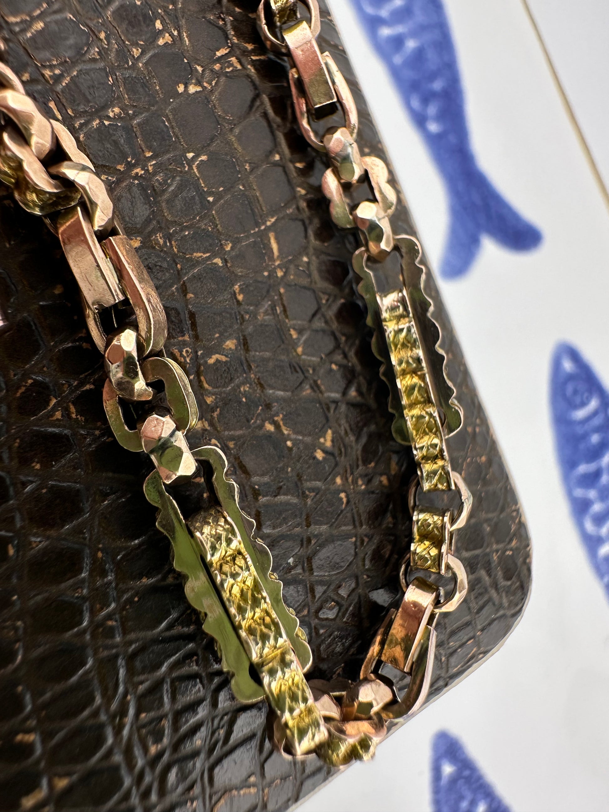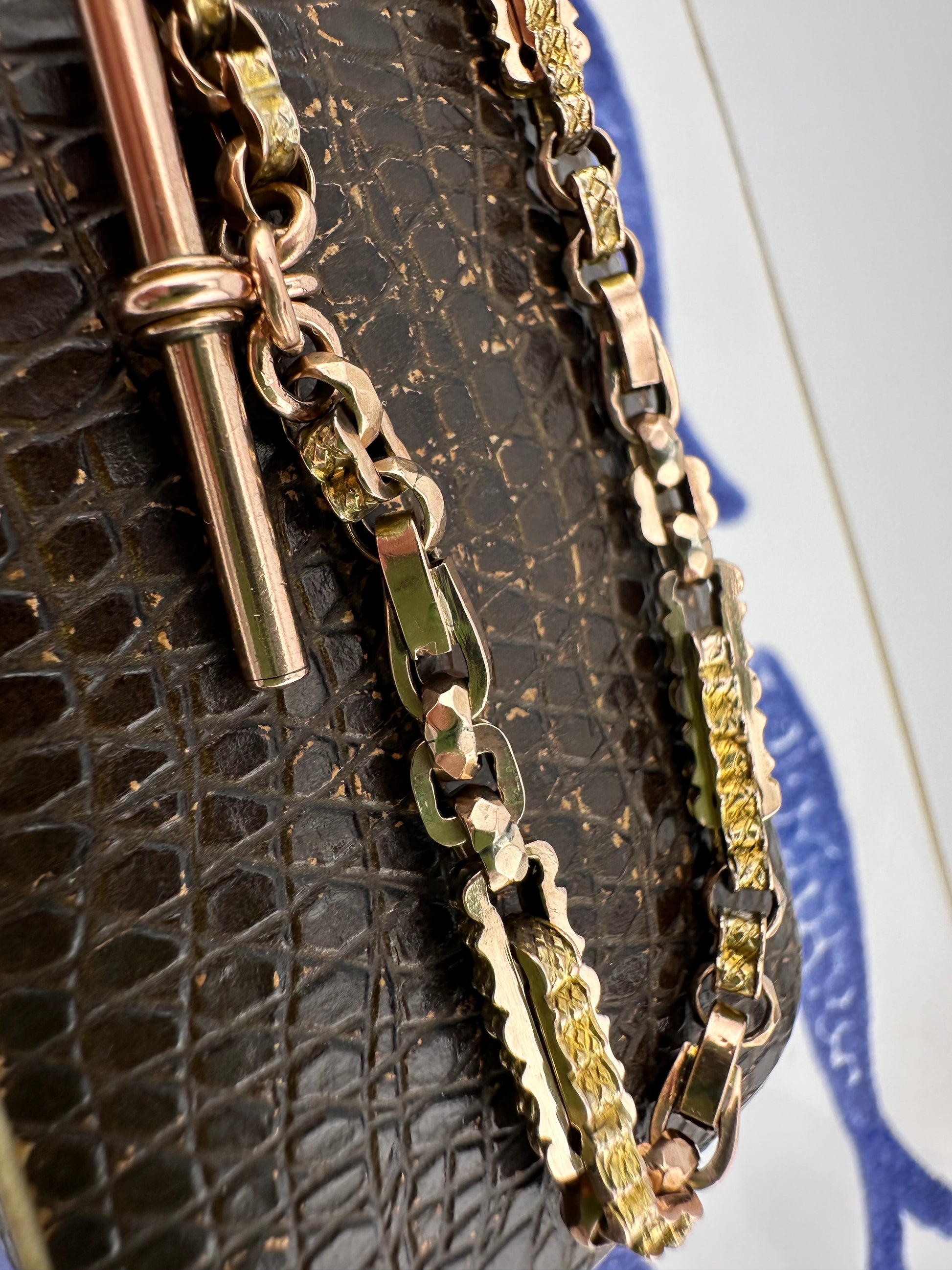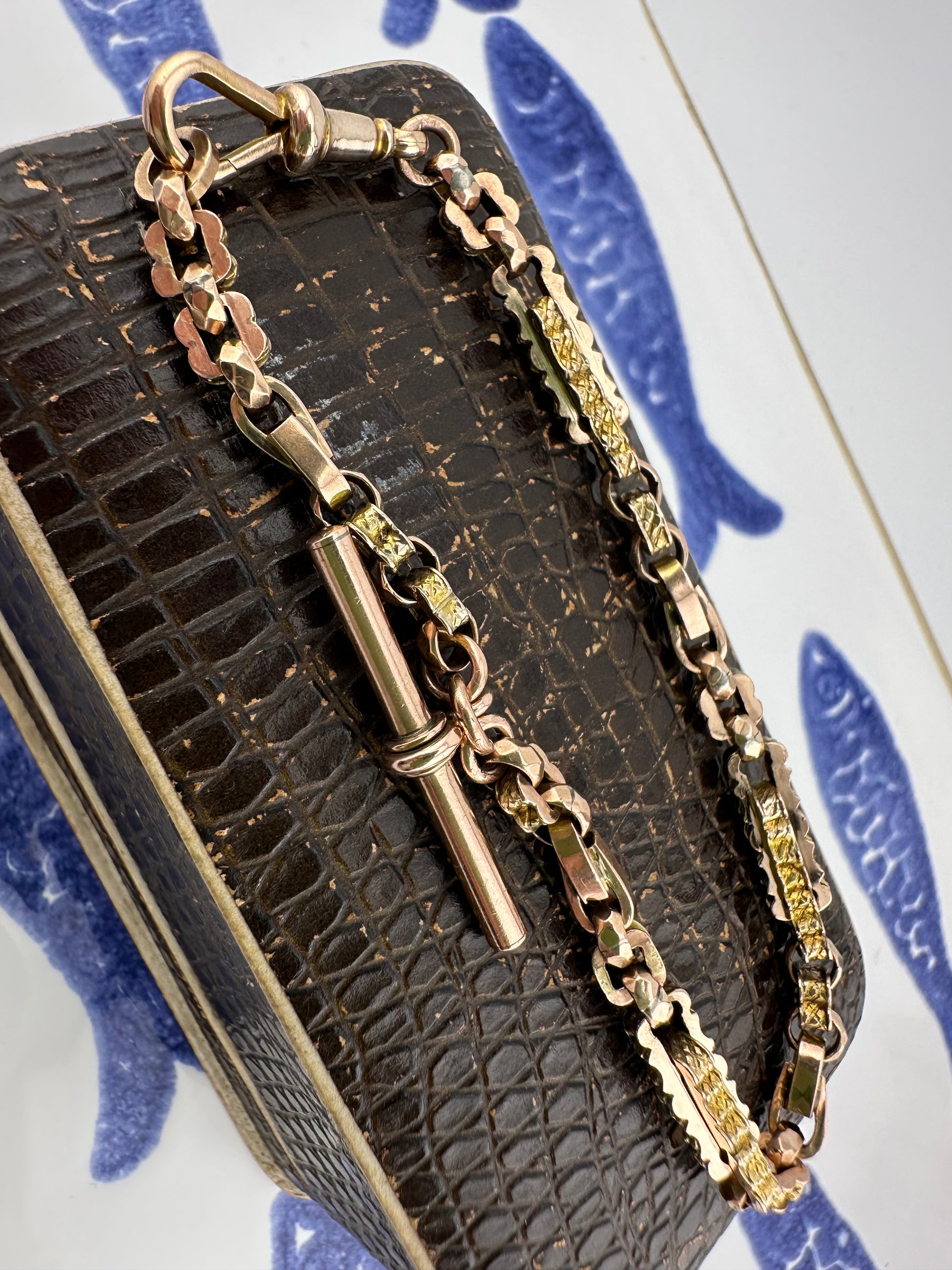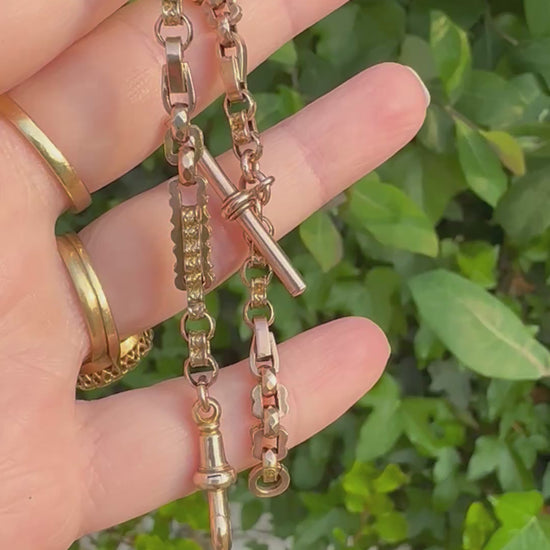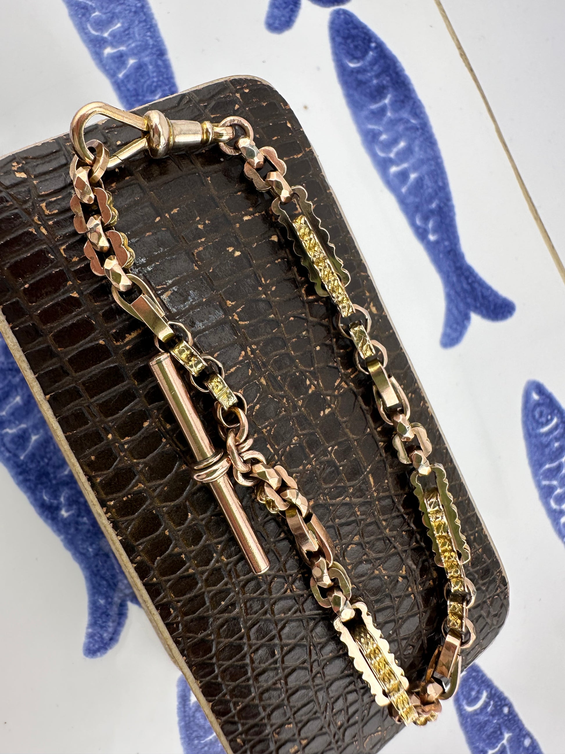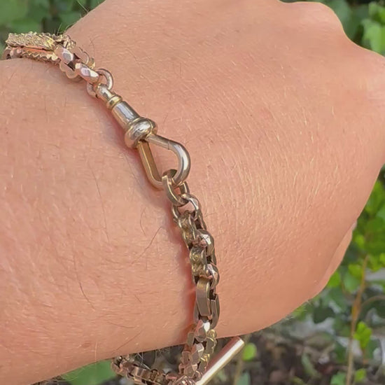 This bracelet is gorgeous, it has a mix of links including patterned book links, square pattern links, tulip links and faceted belcher links. It makes for a super interesting bracelet. This bracelet has been made from an Albert chain and has all the original components.