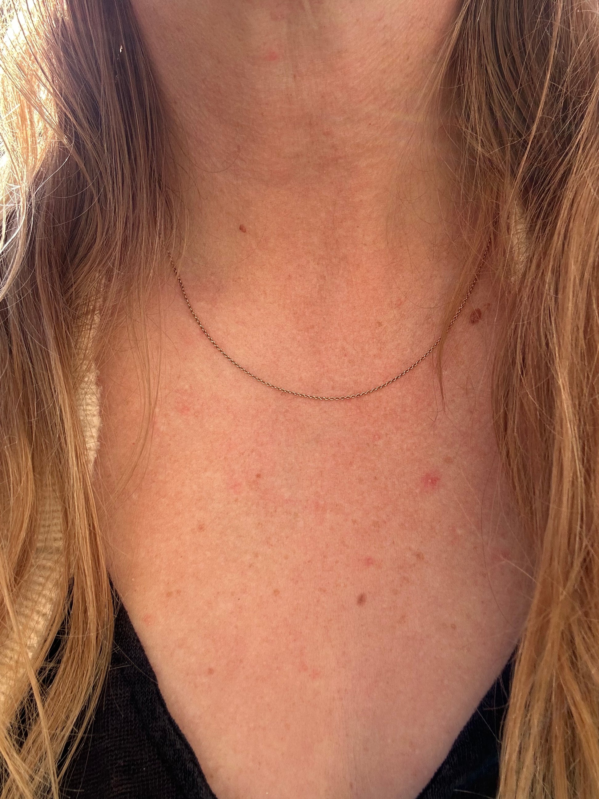 If you’re looking for a charm chain this one is a super pretty one. It is a lovely fine cable link, cable links are a great charm chain option as they are strong. It’s rose gold in colour and antique. The barrel clasp works perfectly.