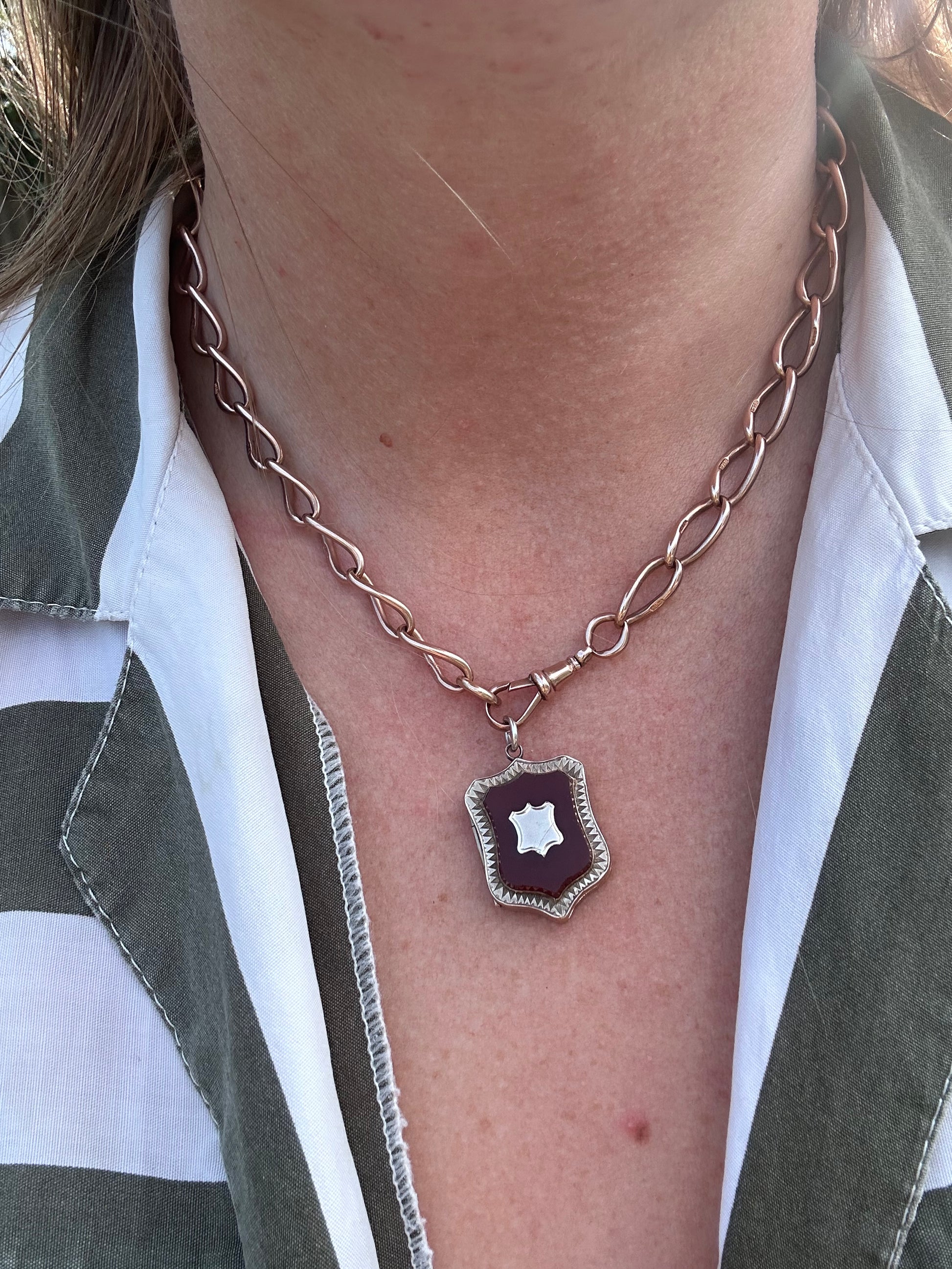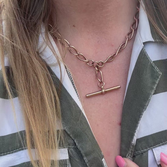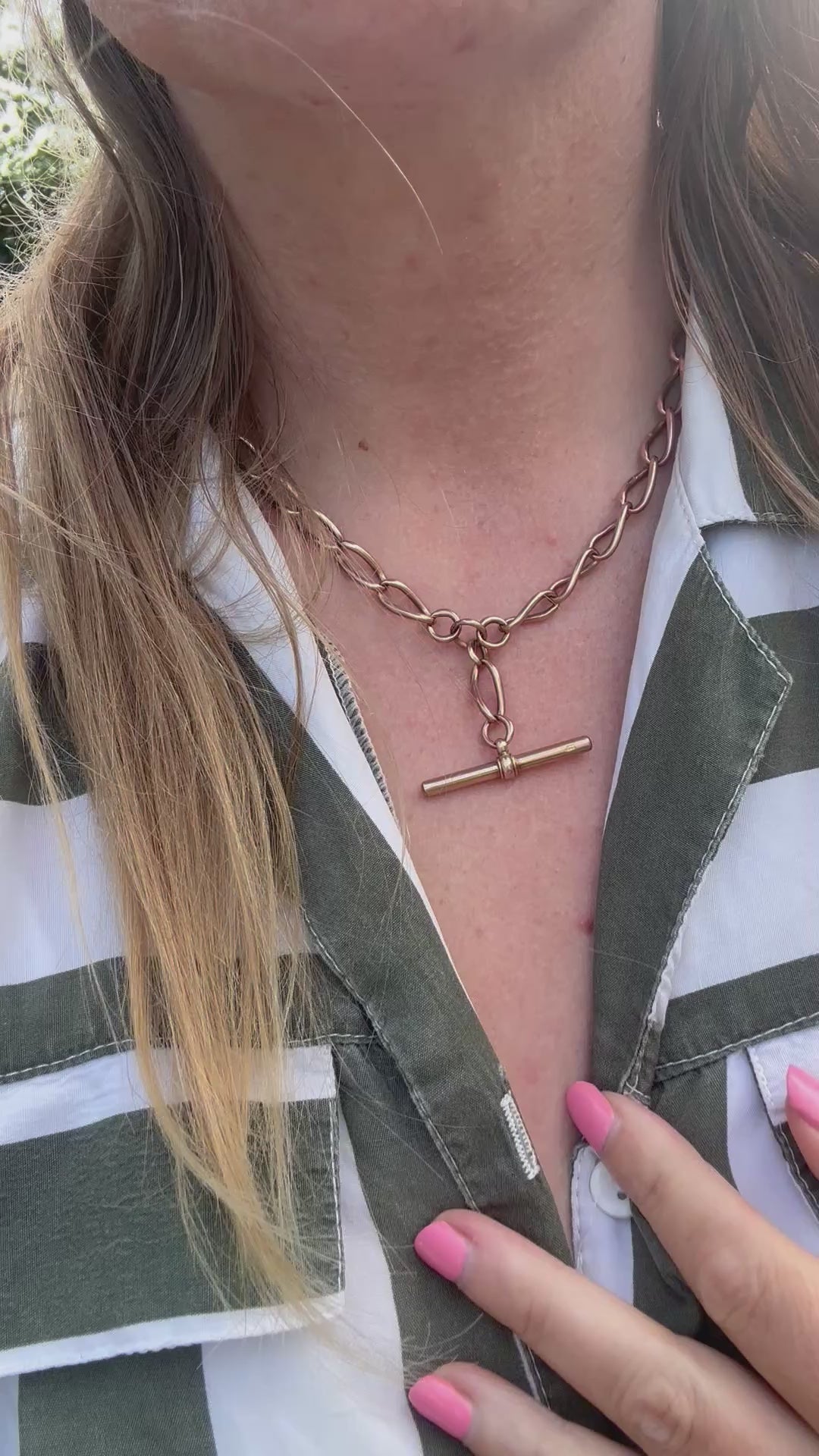 Stunning!! This is a truly fabulous Albert chain. It is so hard to find really wearable lengths in Albert chains and this one being 17inches is perfect. The open curb link is is stunning and every link is stamped 9.375 which I adore. I also love how the t-bar is hung from an open link as well, just a lovely additional detail. It can be worn with the t-bar to the front or switch it around so you can hang a charm from the dog clip.
