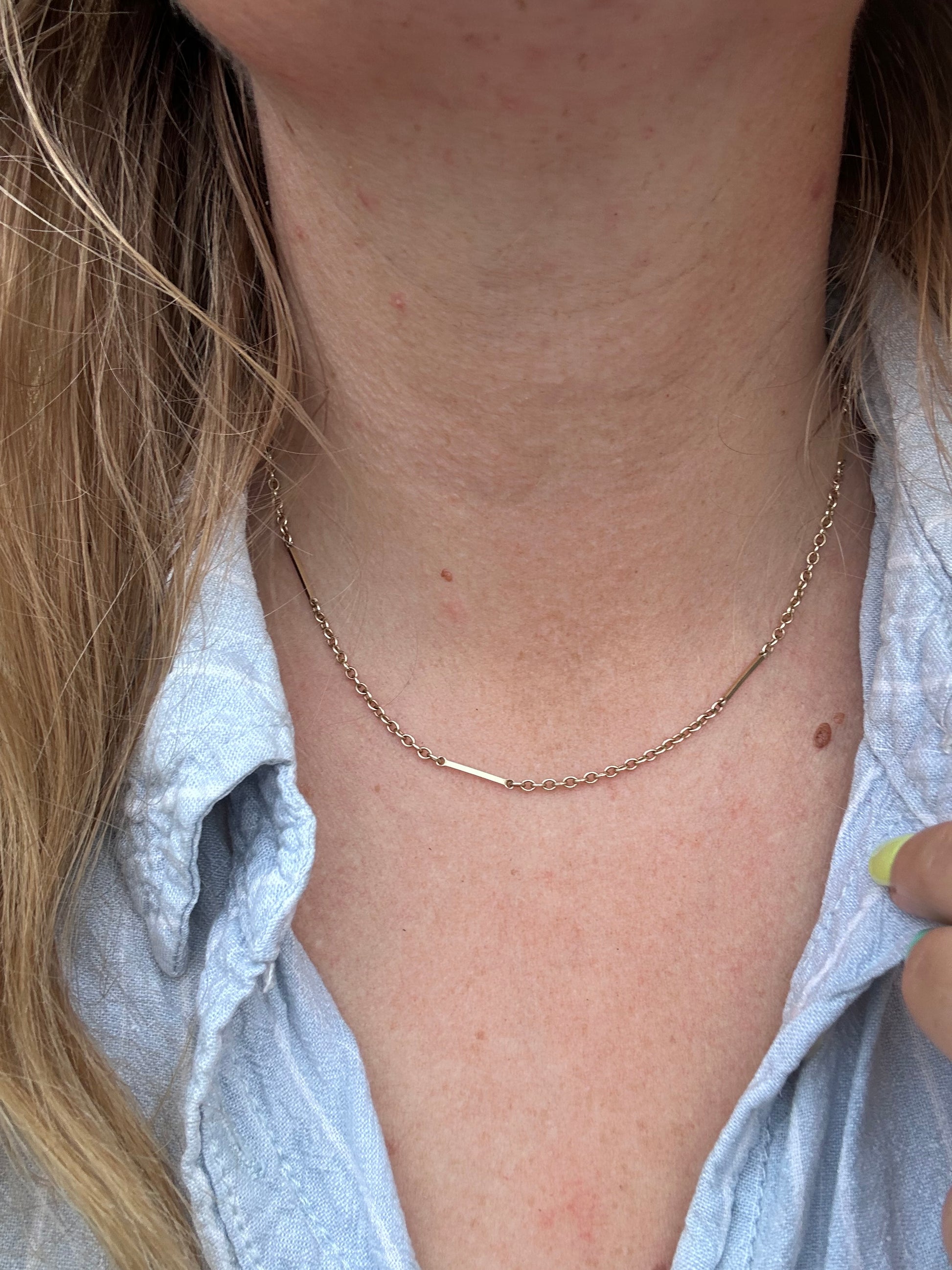 Perfect top layer chain. I love a good bar link chain and if you love your gold yellow this is perfect. It has this lovely cable chain interspersed with the squared bar links which are lovely and shiny. This chain will add interest and shine to any neck stack. I love the little bolt clasp it’s perfect for adding charms and pendants.