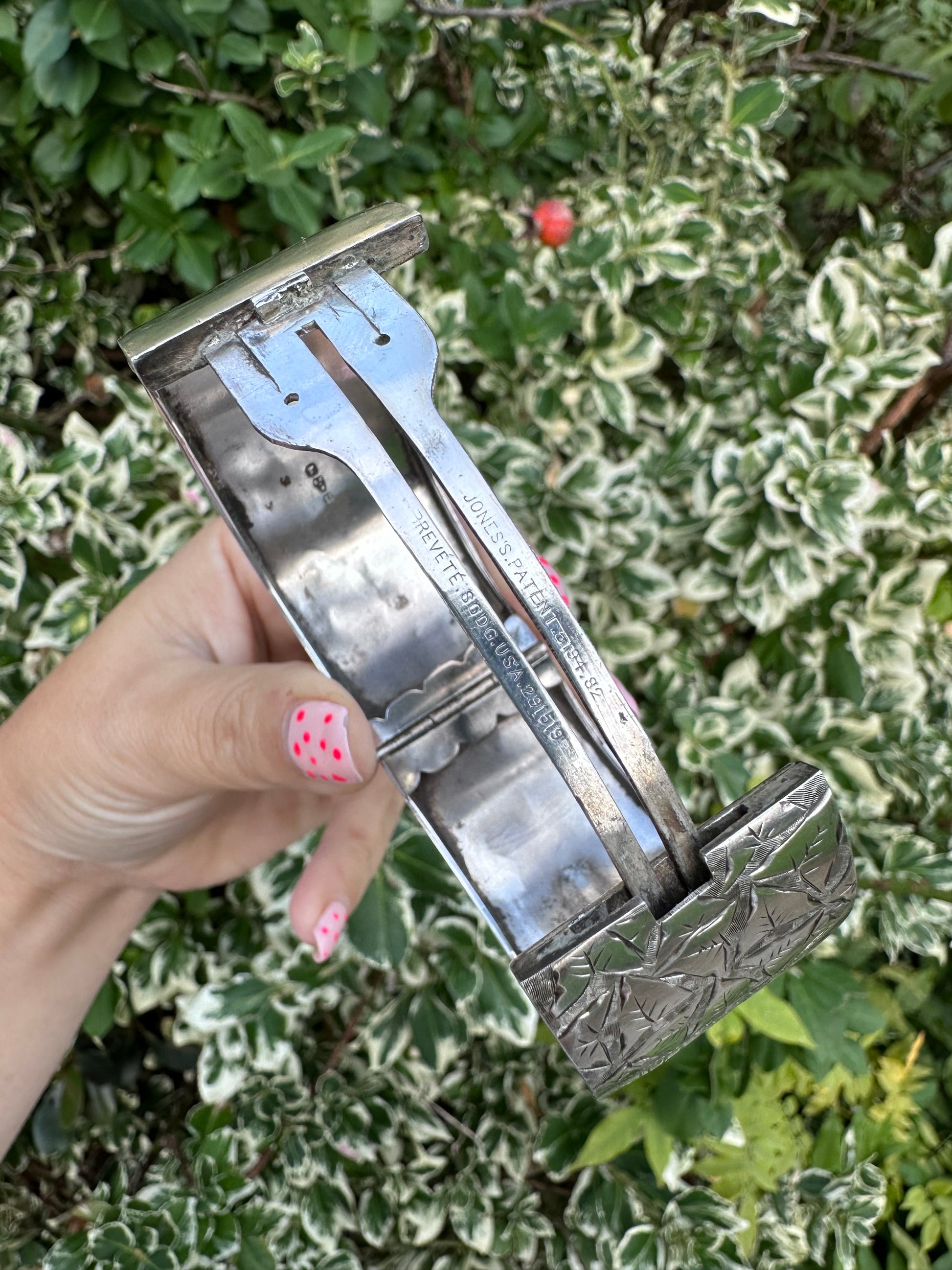Statement! This will add some serious drama to your wrist stack, she’s wide and ornate! The engraving is stunning with a little hummingbird and ivy leaves it’s such a classic for that era. The bracelet is assayed in Chester too so is a collectors piece. The clasp/hinge has an American patent number on it so that’s super interesting too. It’s just fabulous.