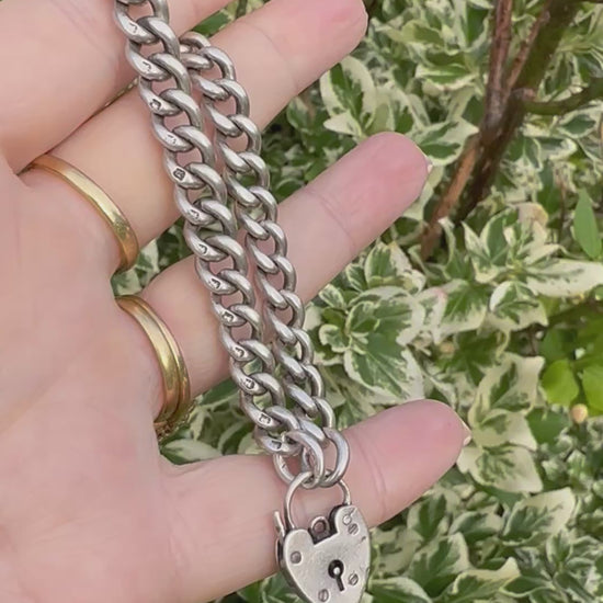 Antique Sterling silver graduated curb bracelet with vintage heart padlock clasp