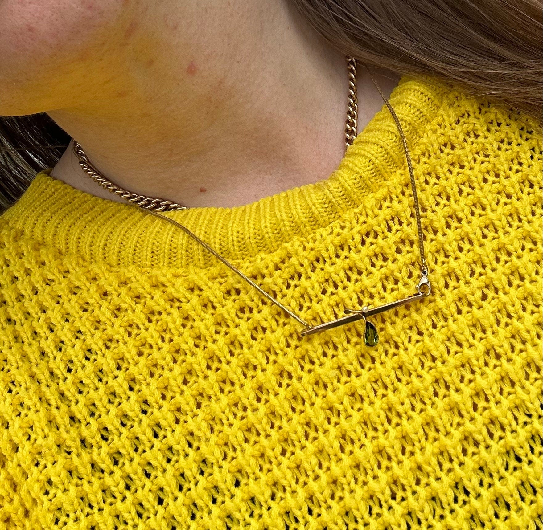 Edwardian 15ct gold peridot & pearl brooch. Fantastic pear detailed bar brooch. The lovely pearl cut peridot is such a fabulous colour and I love that it’s been turned into a pear using the pearl as a leaf and a gold stalk, it is so cute. The peridot is milgrain bezel set. It looks fabulous both as a brooch pinned to a lapel/top/dress or as a chain extender as shown in the pictures.