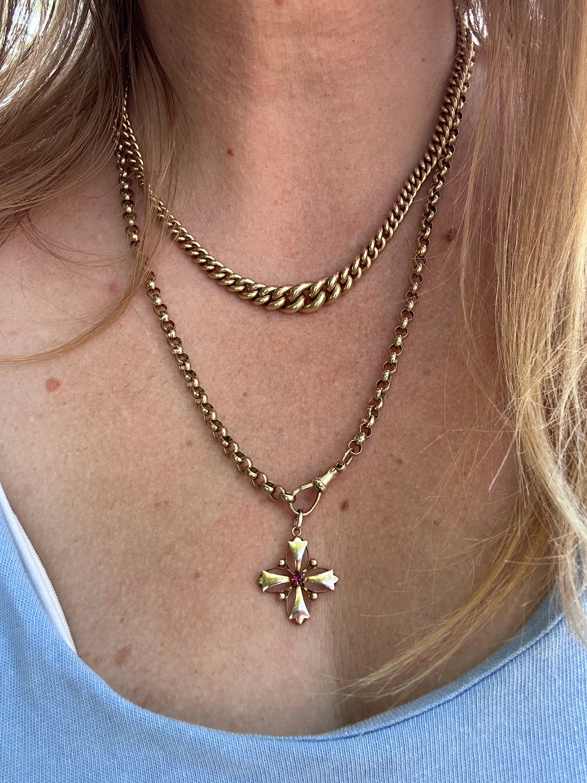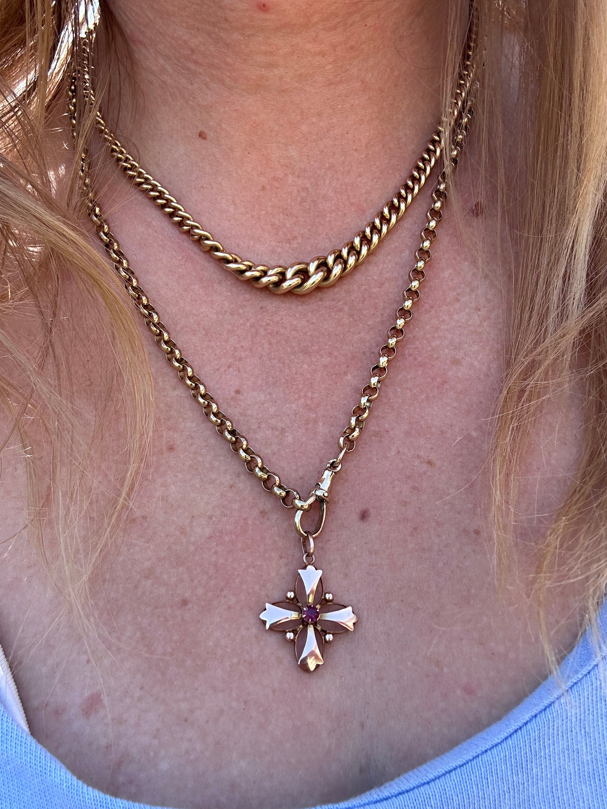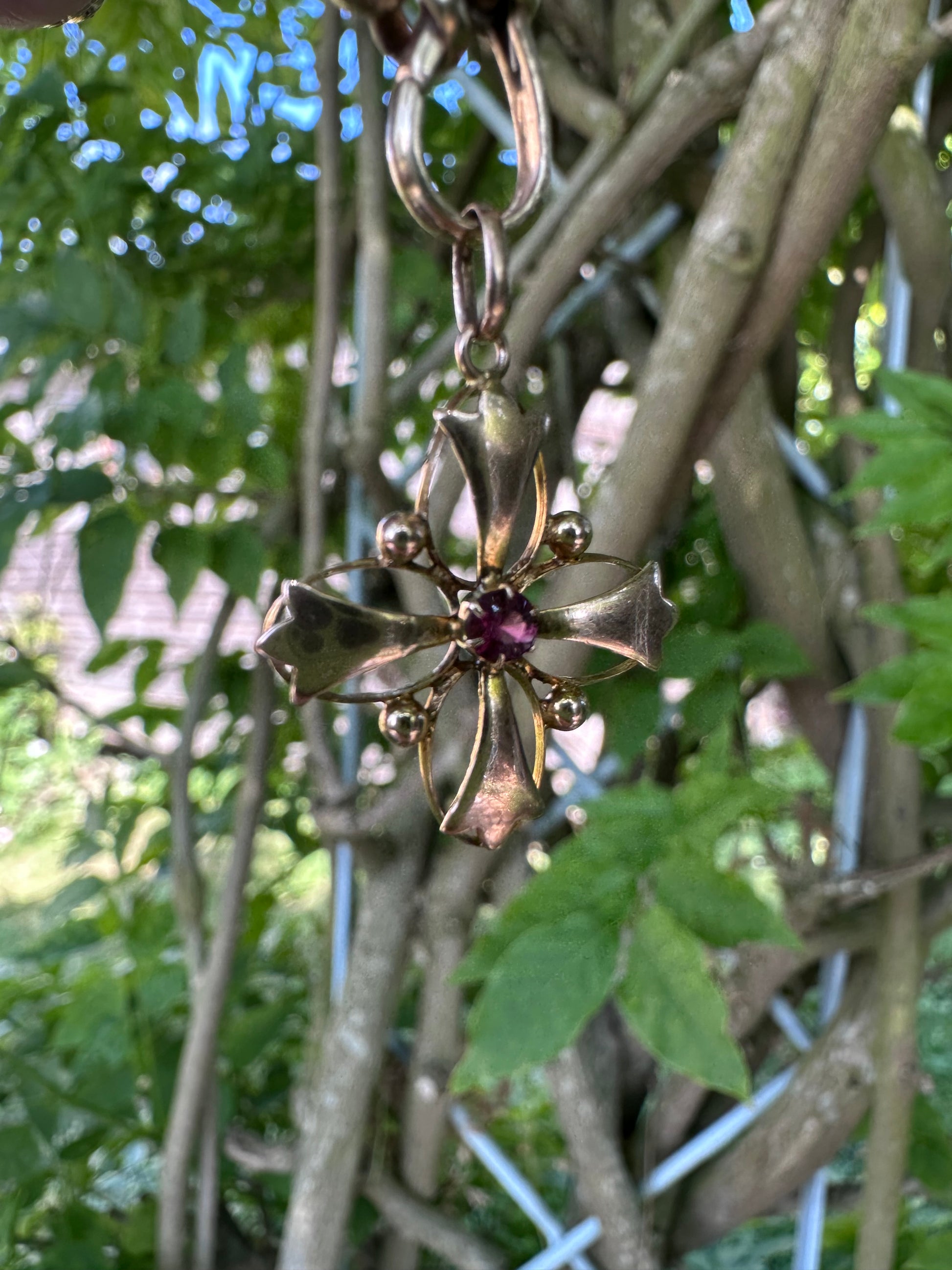 This is a really pretty sweet lavalier pendant, which is the epitome of Edwardian design. It’s shape almost like a Maltese cross but it reminds me of a flower. There’s a sweet amethyst in the centre which is a lovely pinky purple colour which is always a fab colour to add to your neck stack.
