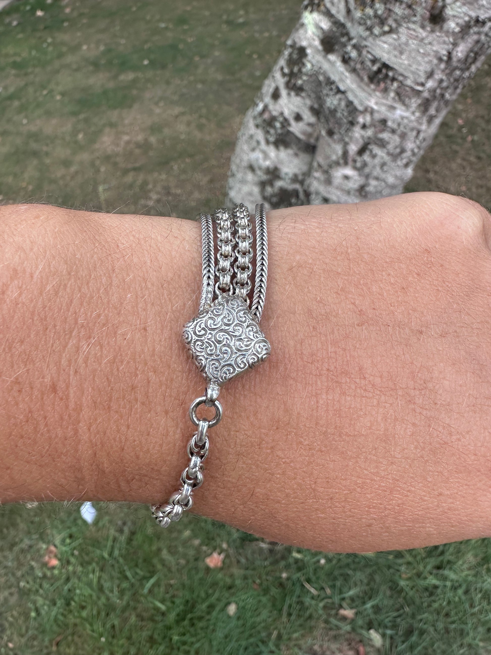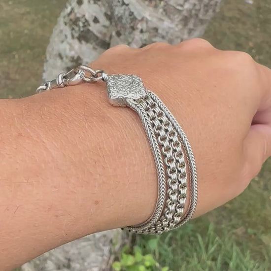 Albertina chains are so pretty! This one is no different it has all the details you could possibly want, two square shaped links which are engraved with swirls which are very pretty, ribbed belcher chains and foxtail chains. Plus a wrapped belcher chain which dog clip to secure this pretty bracelet together. It looks so good on and would make a perfect addition to a wrist stack.