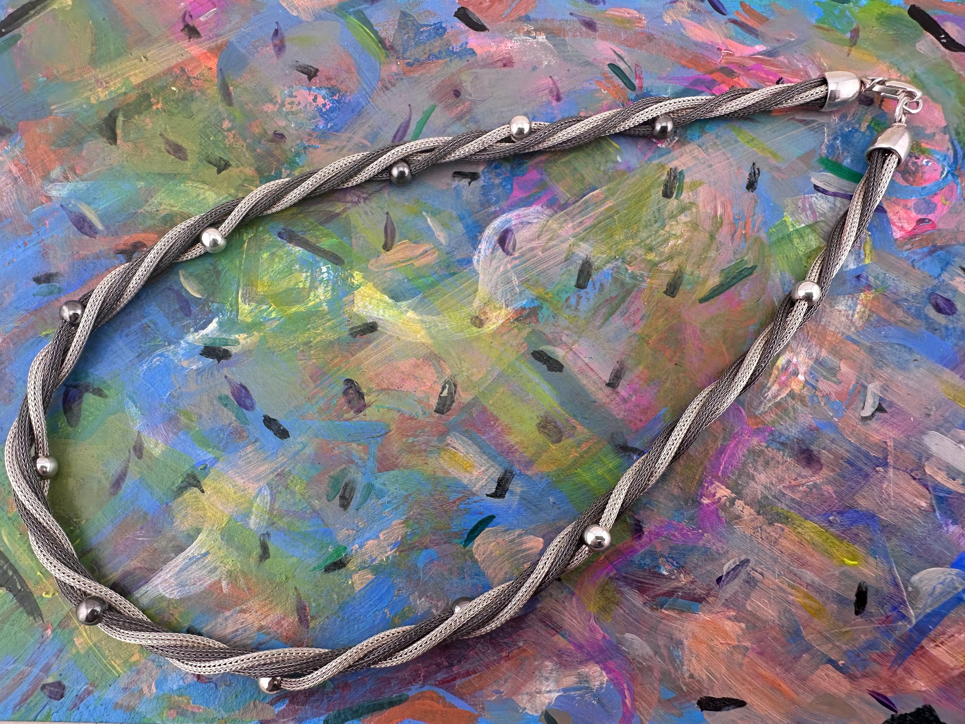 If you love you silver chains big and bold this is a stunning option for you. I love the mix of burnished silver and shiny silver. The mesh chains then twisted together to create a rope look is very cool. There’s then the addition of not burnished and shiny silver balls just to add a little more interest. It would look so good as part of a stack but it can definitely hold its own and be worn individually.