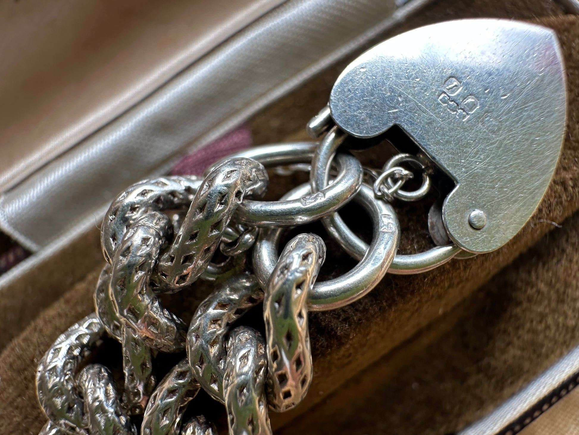 Hallmarks- on heart padlock: London assay, lion for sterling, worn makers mark, I=1964. Lion for sterling on chain.