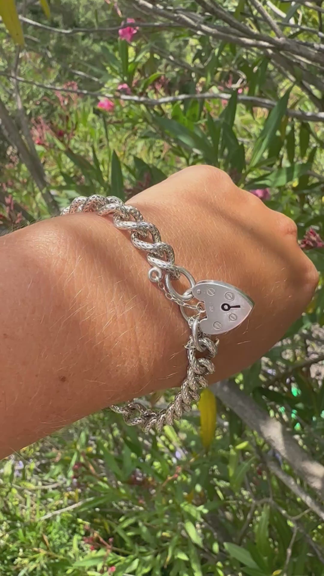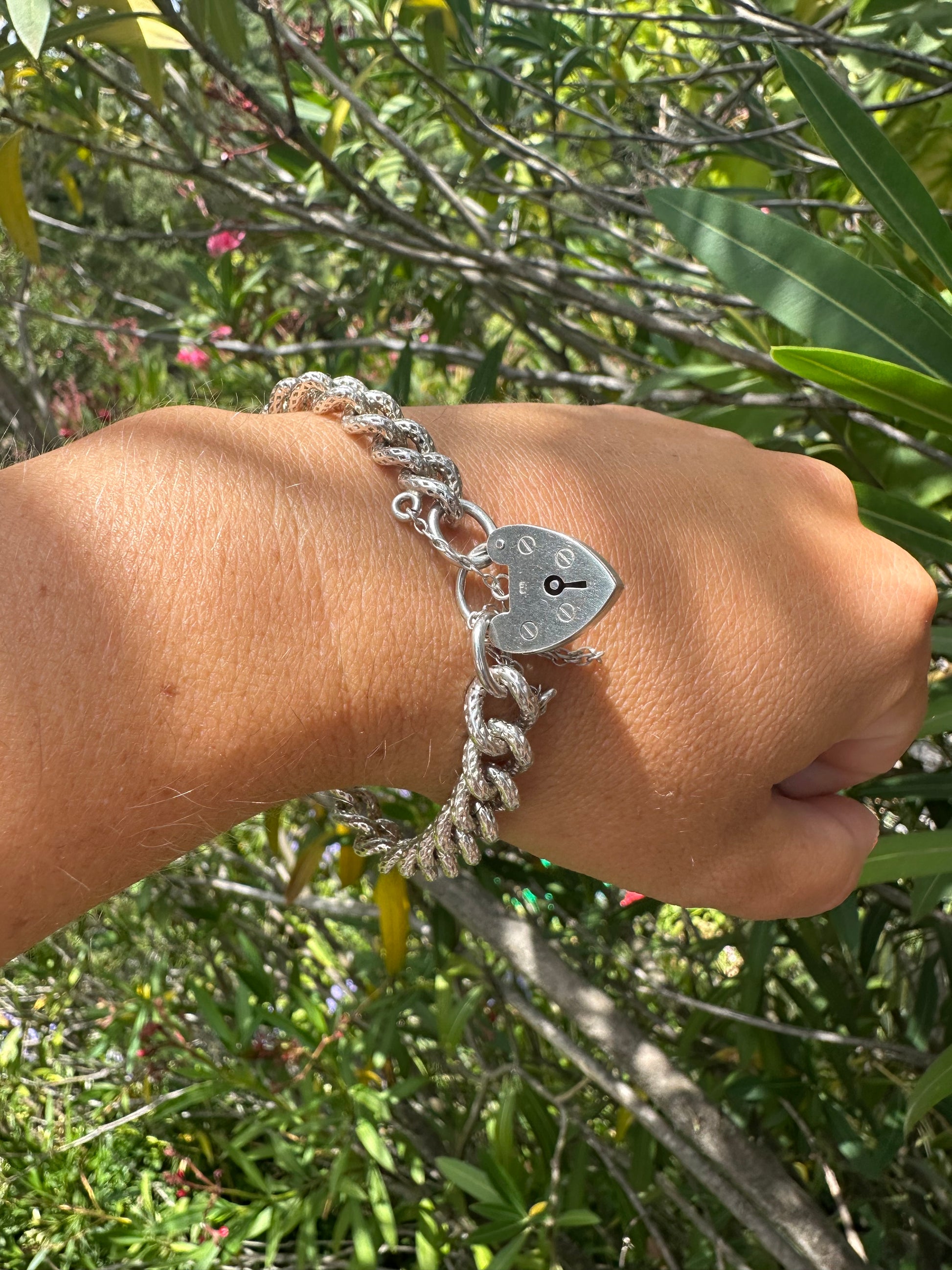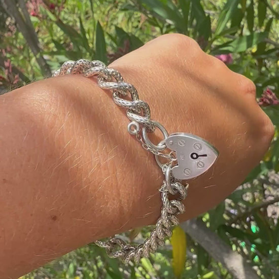 Sterling silver textured chunky curb bracelet with heart padlock