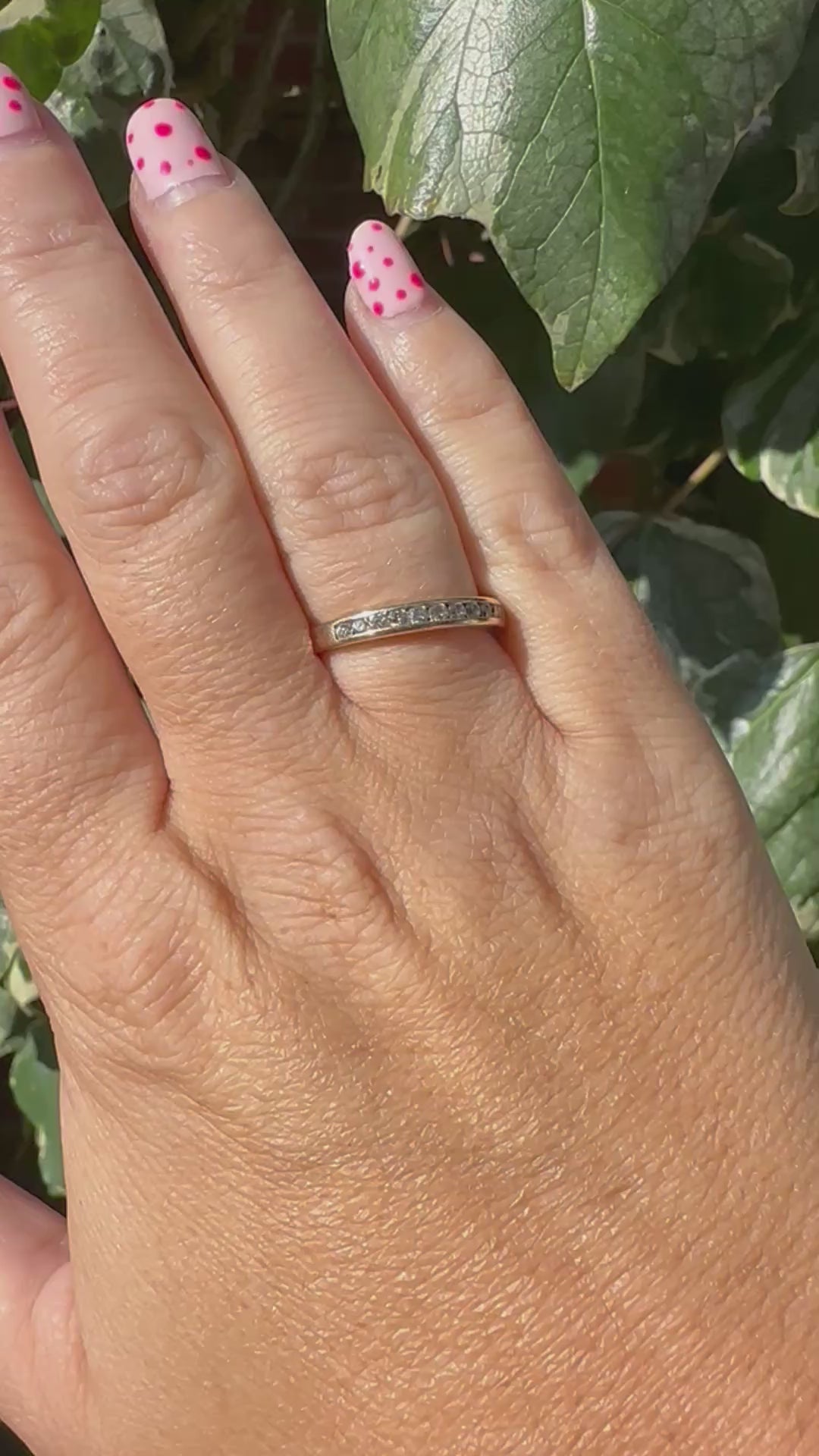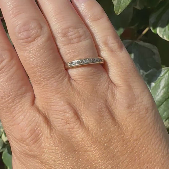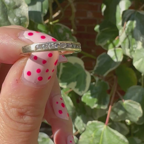 If you’re looking for a sparkly number this is perfect. This makes a great stacker ring to add to your ring collection. It has a fabulous profile and is set with 11 round diamonds which have fabulous sparkle both indoors and out. I love the channel setting meaning the diamonds don’t protrude from the setting so it is comfy and perfect to stack with other ring styles. It’s just such a staple piece.