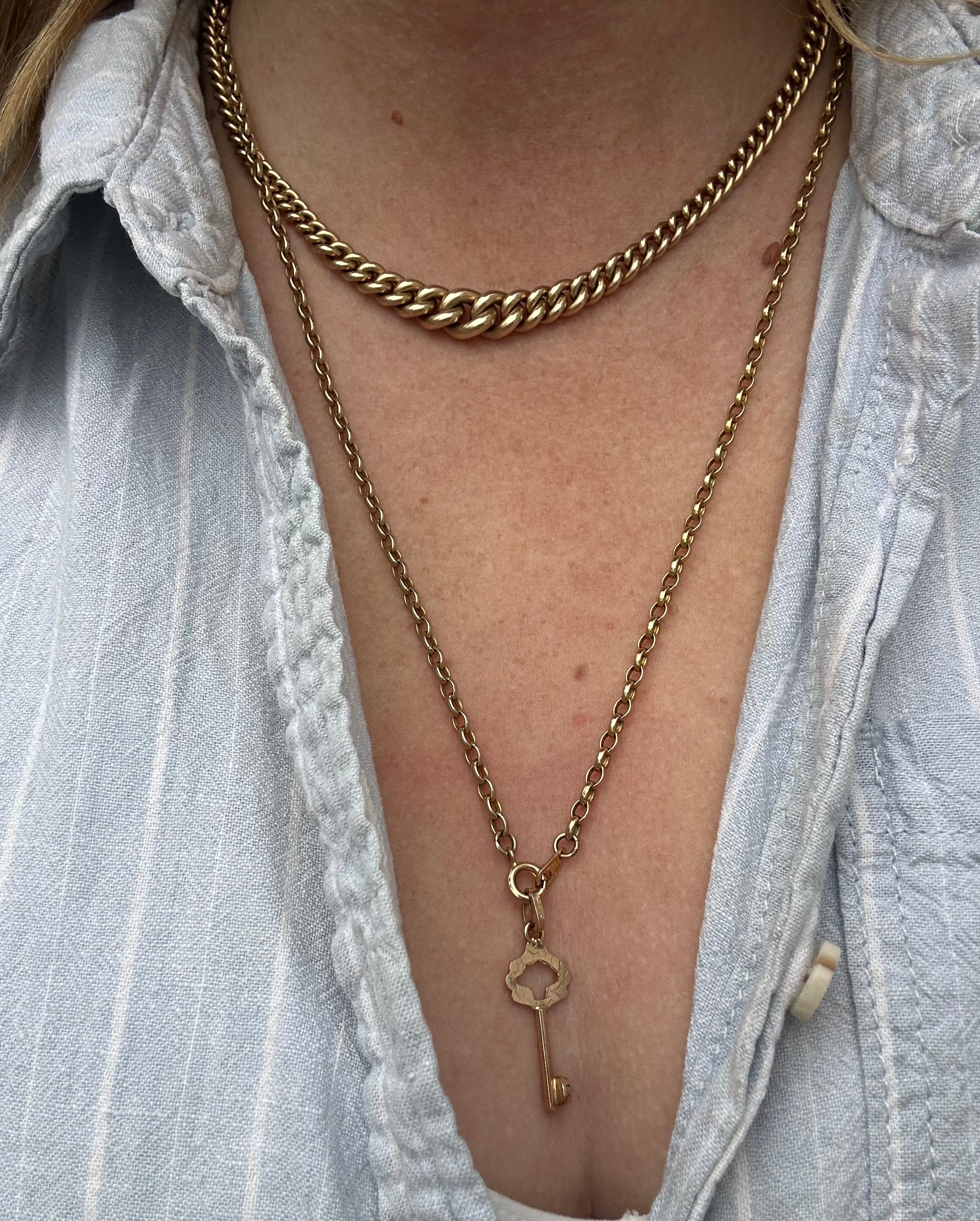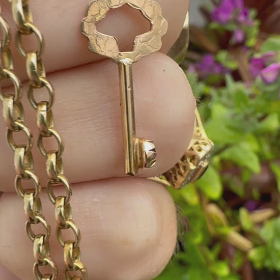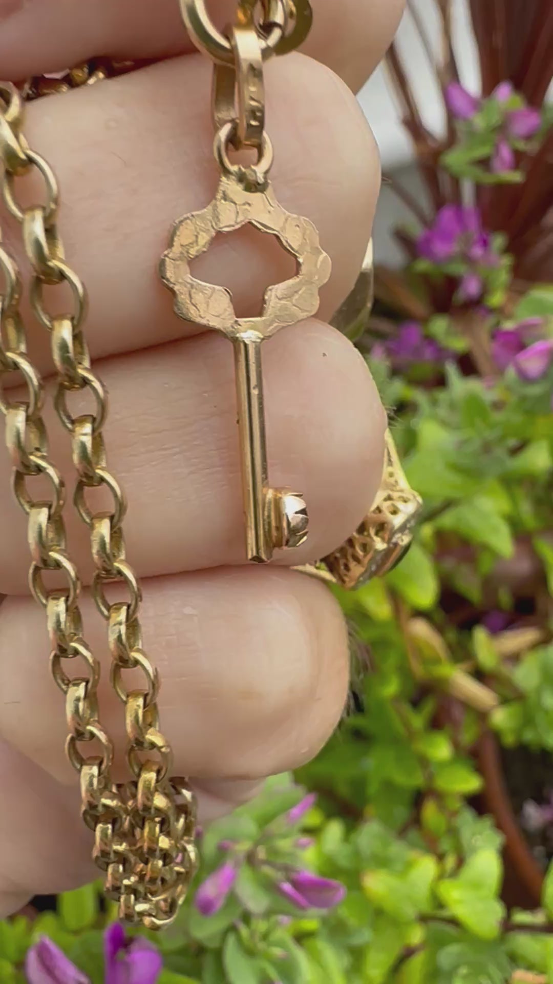 This key charm, is very pretty. It is larger in size than a lot of key charms I’ve been lucky enough to source. There is some very sweet delicate engraving to the top of the key which is pretty. The bottom of the key has a lovely paste cabochon which is greeny/yellow in colour. It would look so good in a neck stack.