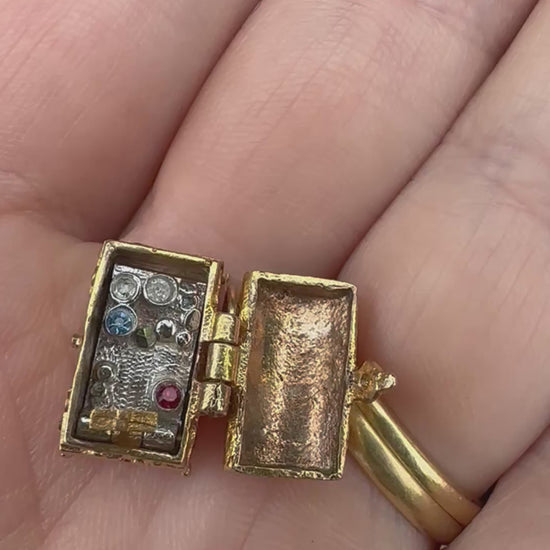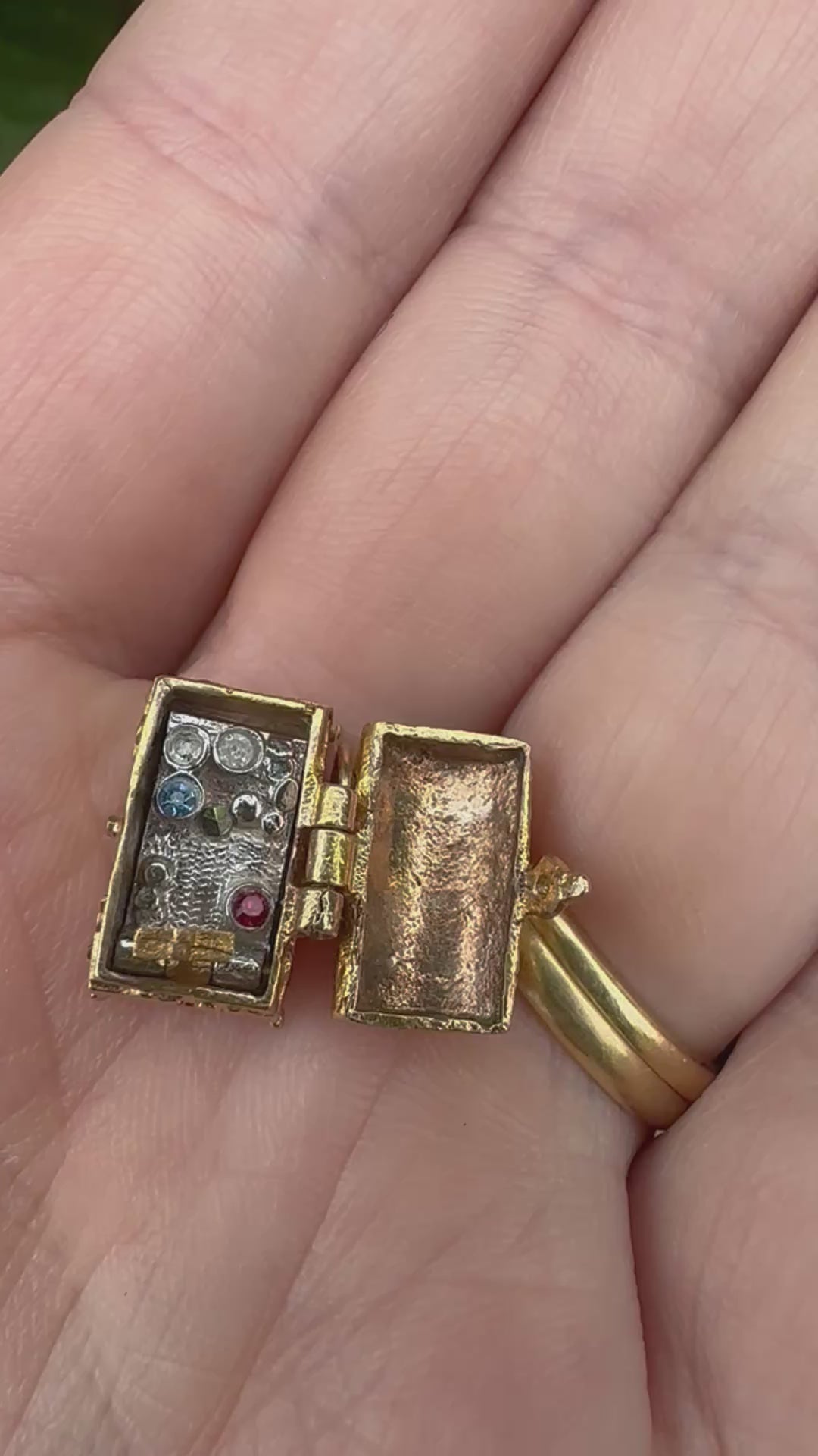You don’t know how long I’ve been looking for one of these, I’ve been trying to find one with actual treasure and I’ve now managed it and so happy to be able to offer this to you. It’s a lovely ornately engraved piece and once opened you have inside two diamonds, two paste stones (red & blue) and a marcasite stone. In addition to this the cross and base where the stones are also moves up. So it is articulated in more than one way which is very cool.