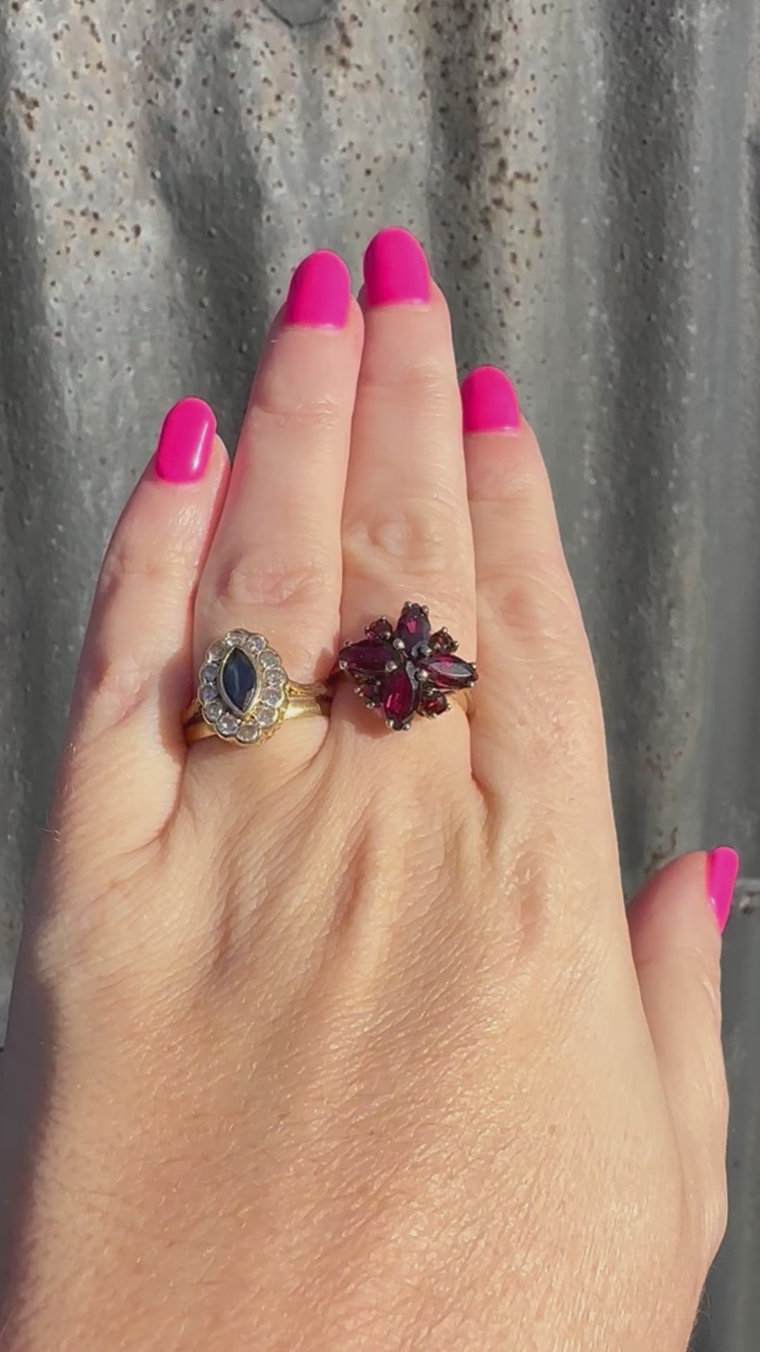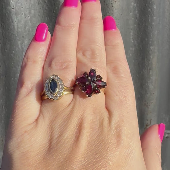 This ring is an absolute stunner. The size and shape of the cluster of Garnets makes it have such presence on the finger. It unusually has 4 Marquis cut garnets as part of the cluster with 4 more round cut garnets interspersing the marquis cuts, it makes for a striking statement ring.