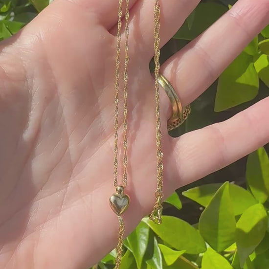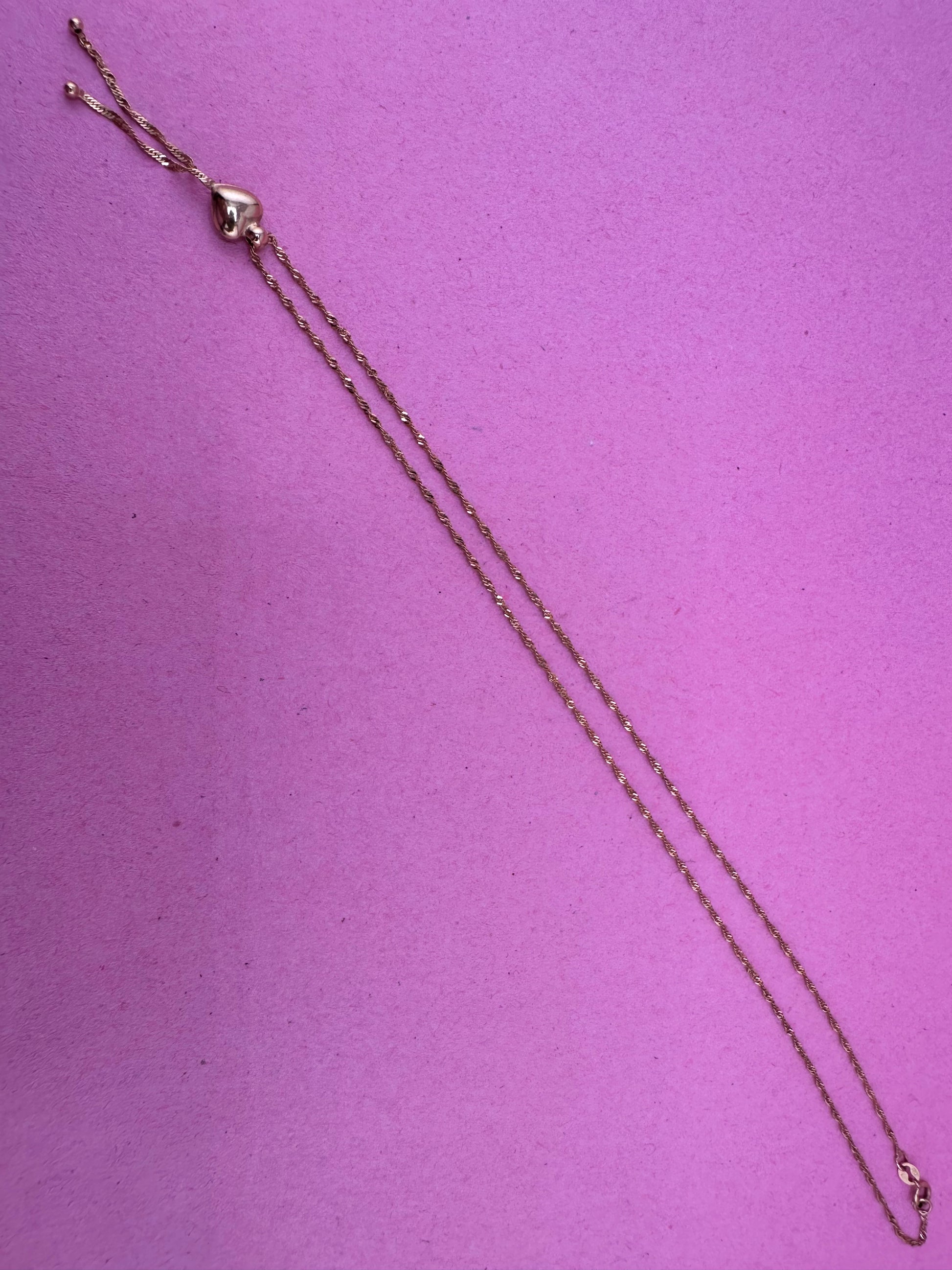 Cutest necklace. This is the sweetest dainty chain, it’s a lovely loose rope chain in yellow gold with a pretty heart slider which has the same loose rope tassel it would looks so good as a dainty top layer to your stack or for a minimal look on its own it would be very cutesy.