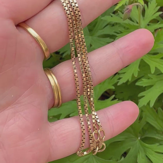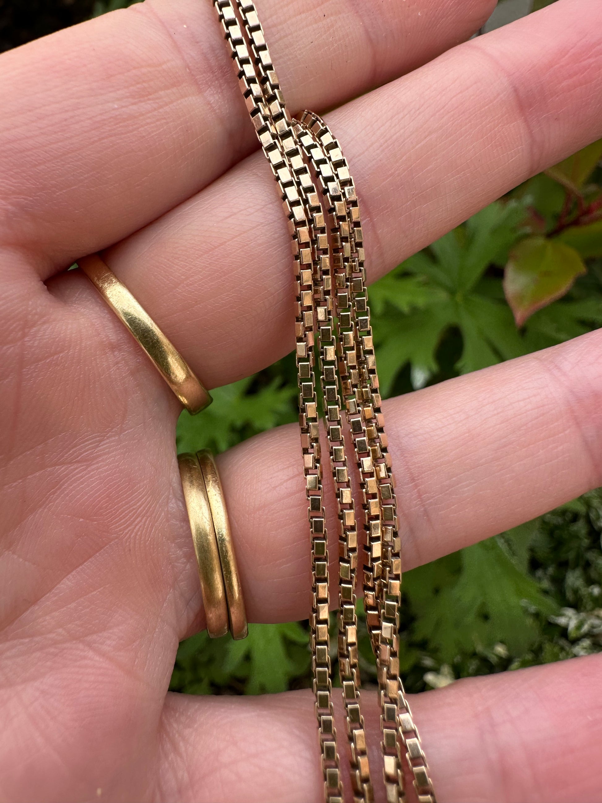 Box chains are fabulous charm chains, they are strong, slinky and look fab. This is a lovely yellow gold box chain and a perfect top layer in your stack at 16.25inches. She’d look fab in your stack with a little charm jumble.