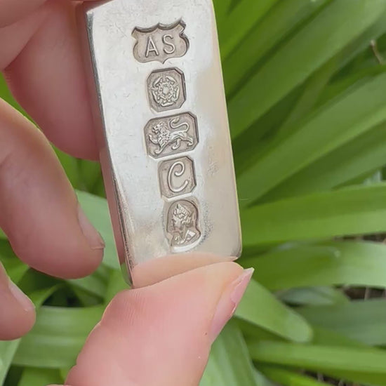 If you’re looking for a matching pair of silver ingots I have two of this available (at time of posting). Silver ingots are such cool pieces to collect, they are also a great way of buying silver if you’re interested in that as a way of investing. This ingot is heavy at 31.15g but wearable on a nice chunky chain. This one (and its matching pair) have Sheffield assay stamps which I have seen less often. The last stamp at the bottom of Queen Elizabeth II is there to represent her Silver Jubilee which happened in 1977, the date of this ingot.